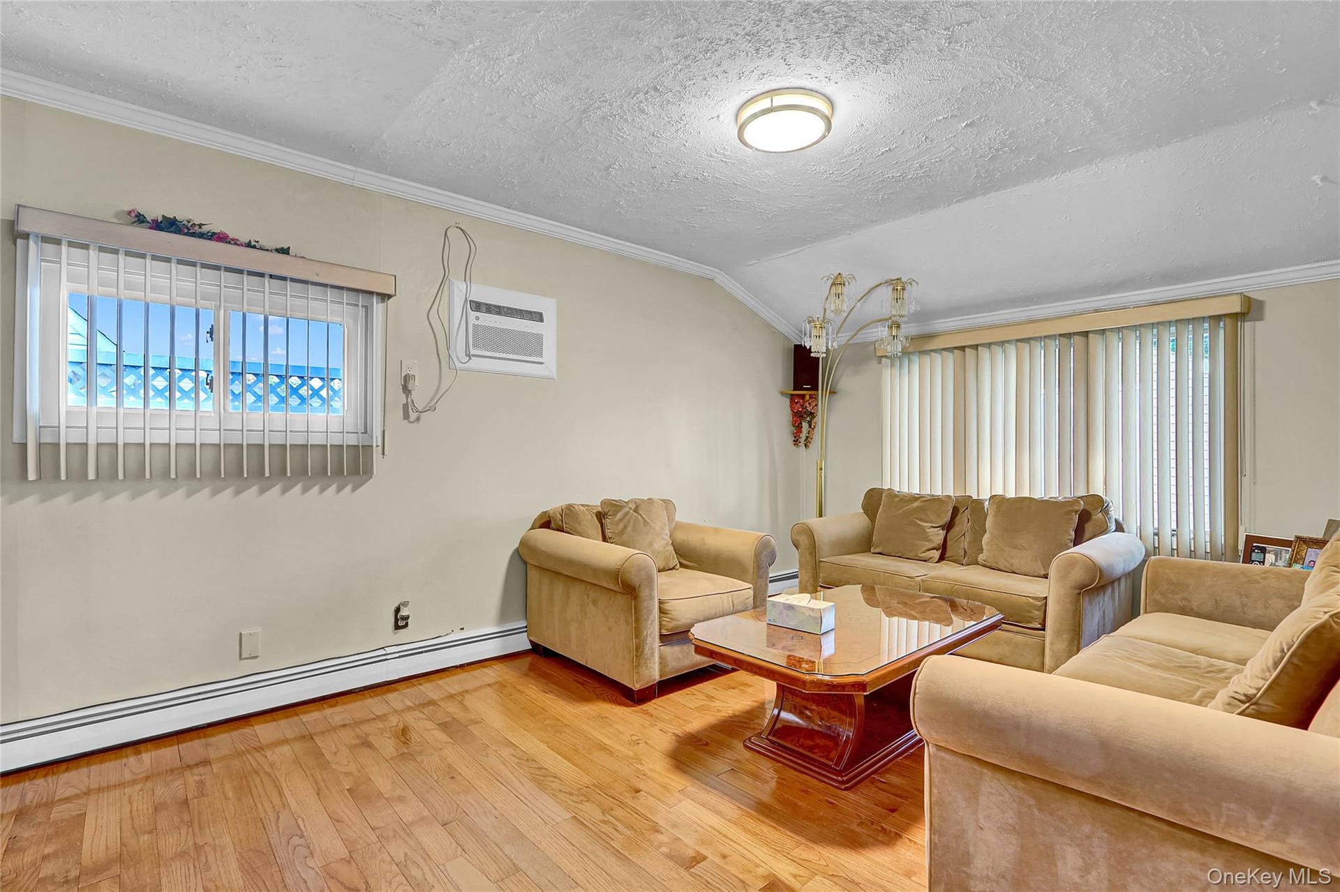 - Living area with a textured ceiling, light wood finished floors, a baseboard heating unit, vaulted ceiling, and crown molding