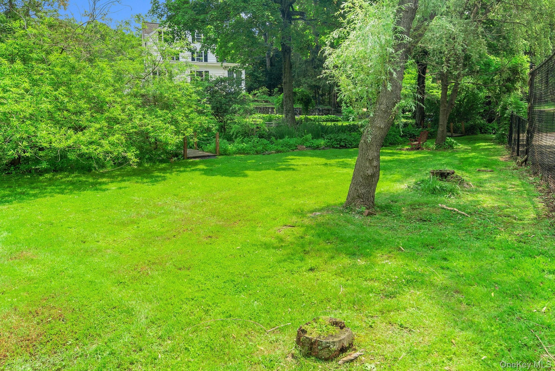 The picturesque grounds feature a gently meandering brook, a charming trellis and archway. A rare find in Pleasantville, the expansive lot also includes a private tennis court awaiting revival—well-suited for recreation or open-air entertaining. Driveway entrance on Pierce Drive.