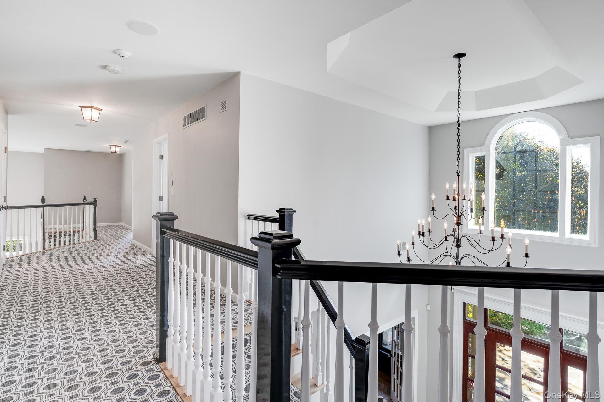 - Corridor with a raised ceiling, a chandelier, and an upstairs landing