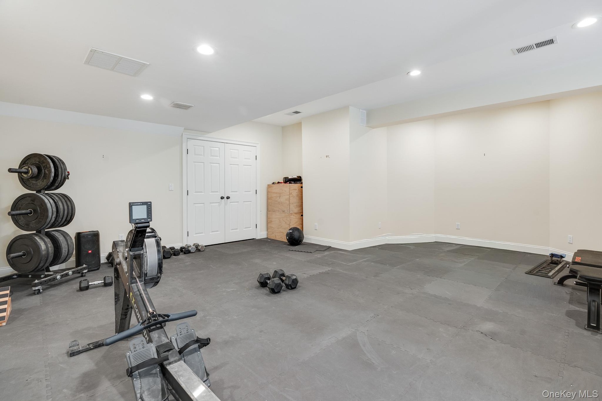 - Rec room featuring recessed lighting, french doors, and light colored carpet