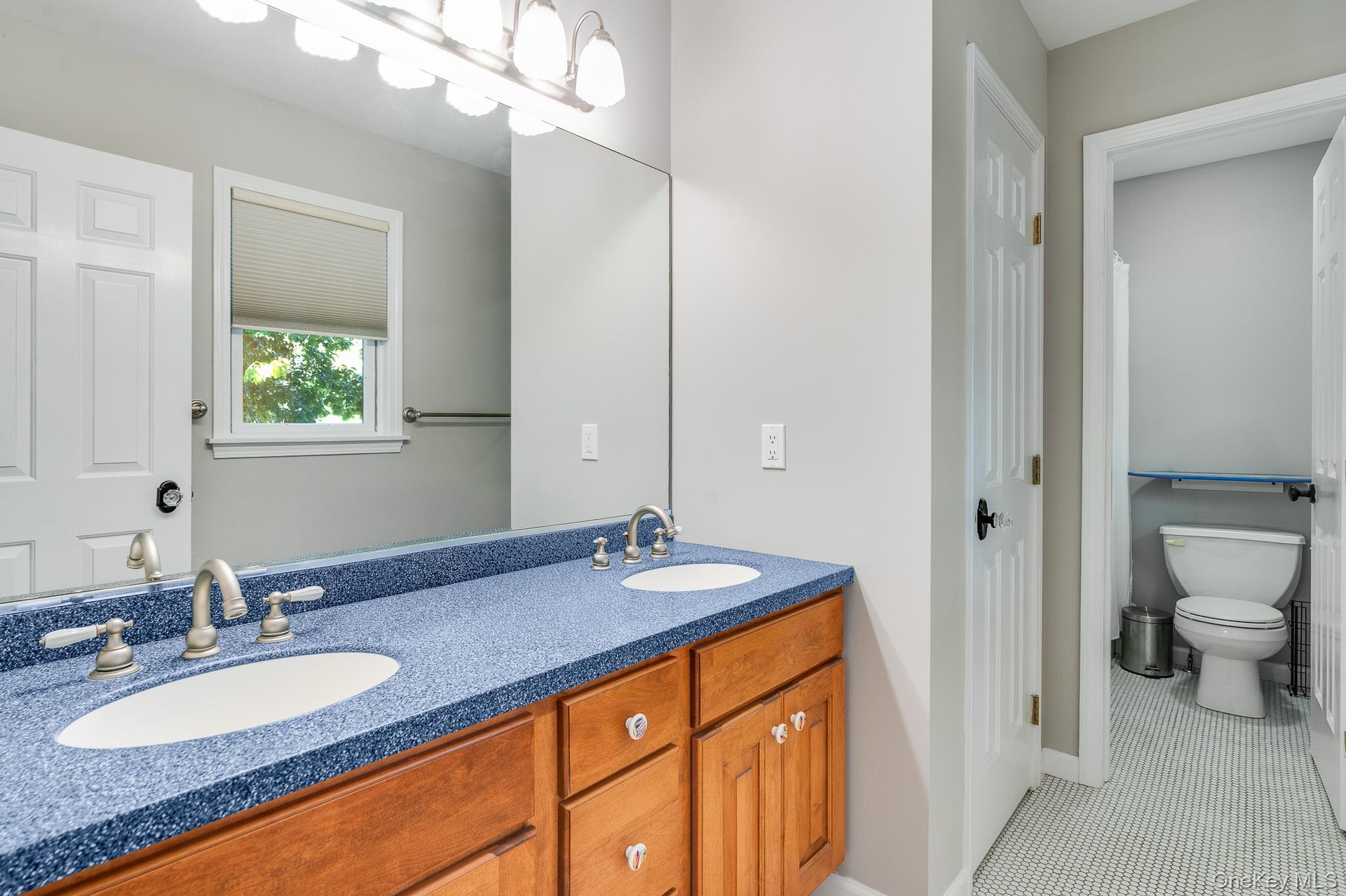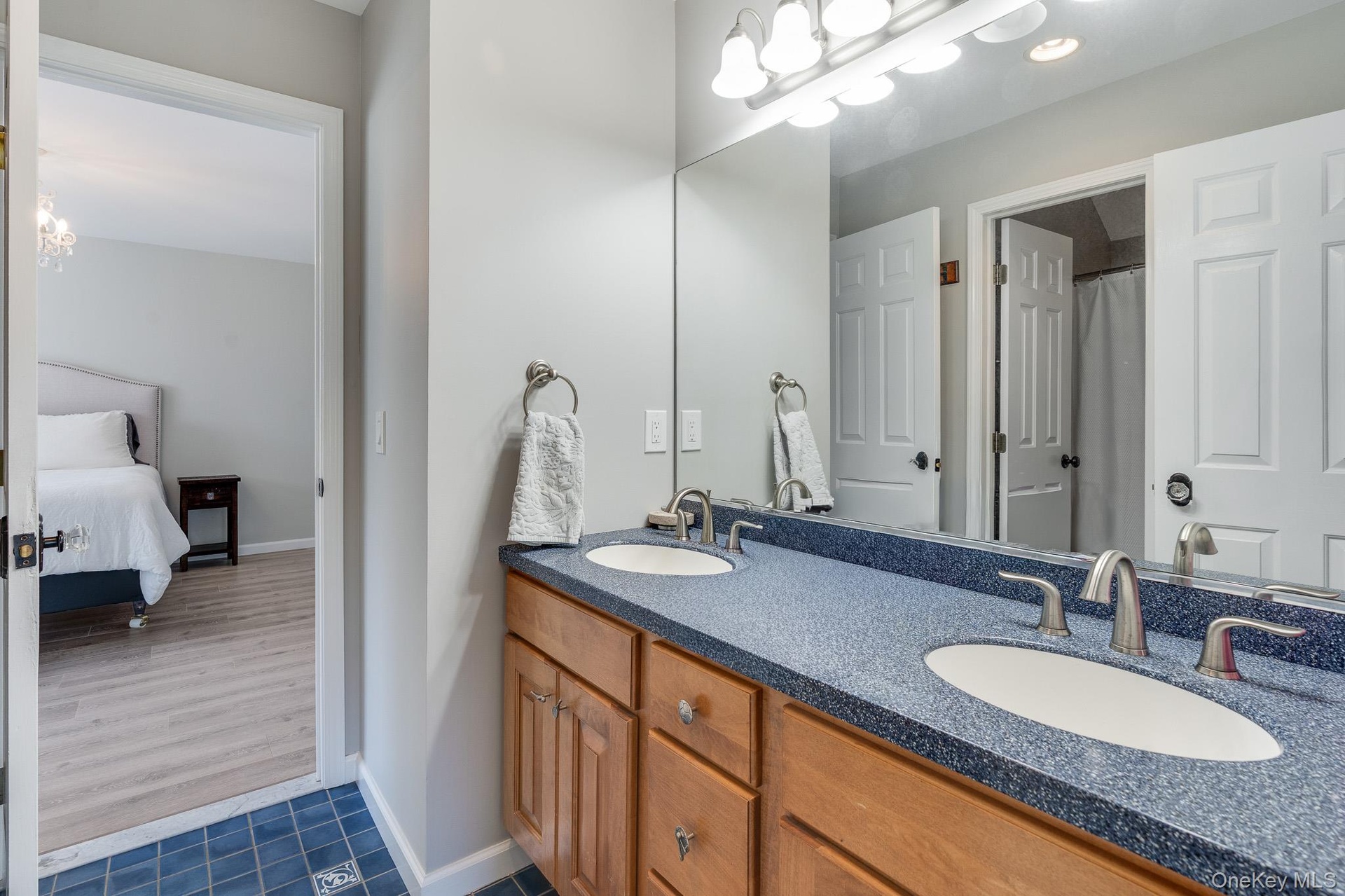 - Ensuite bathroom featuring double vanity, dark tile patterned flooring, and a chandelier