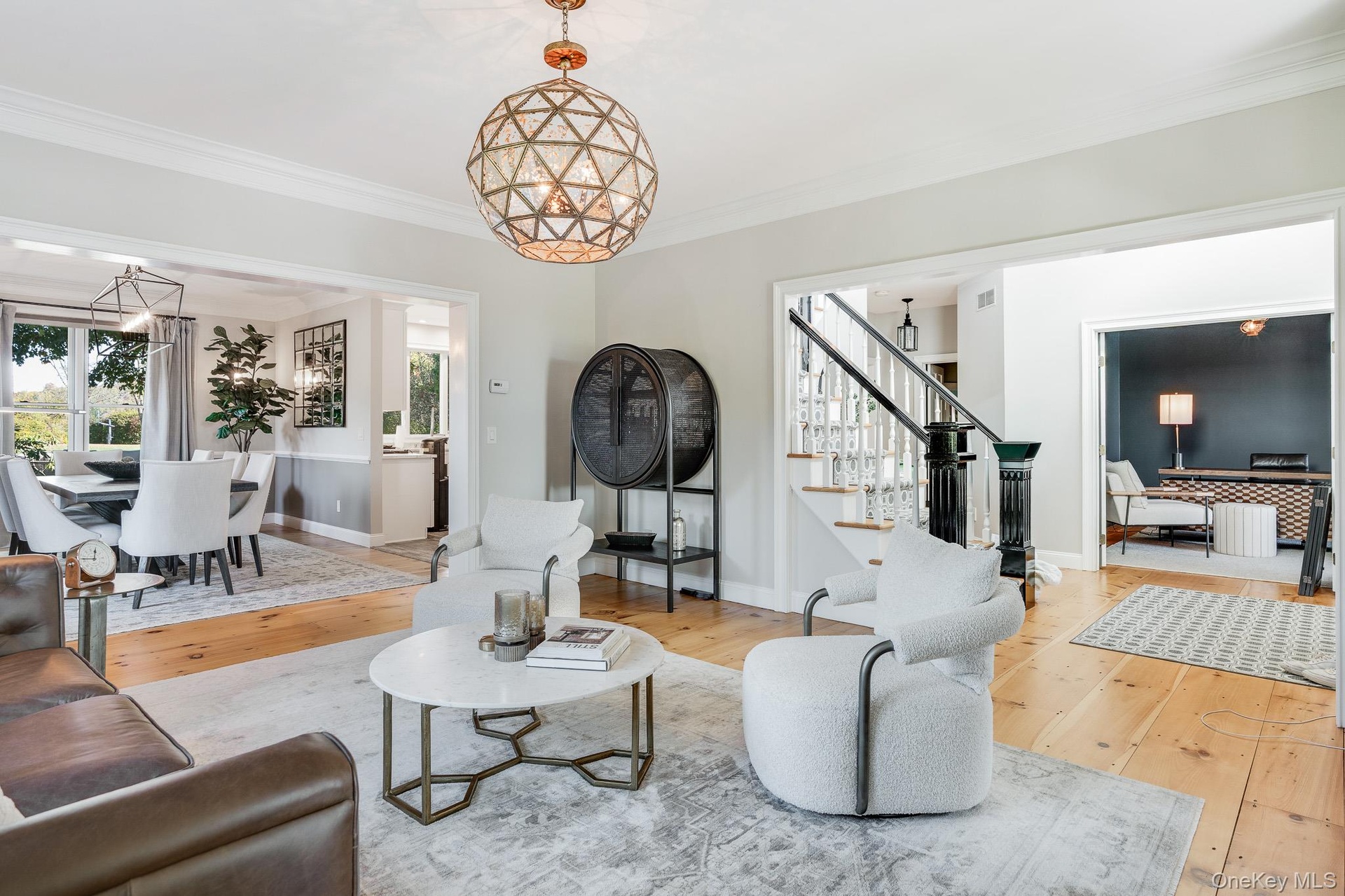 - Living area featuring ornamental molding, wood-type flooring, stairs, and a chandelier