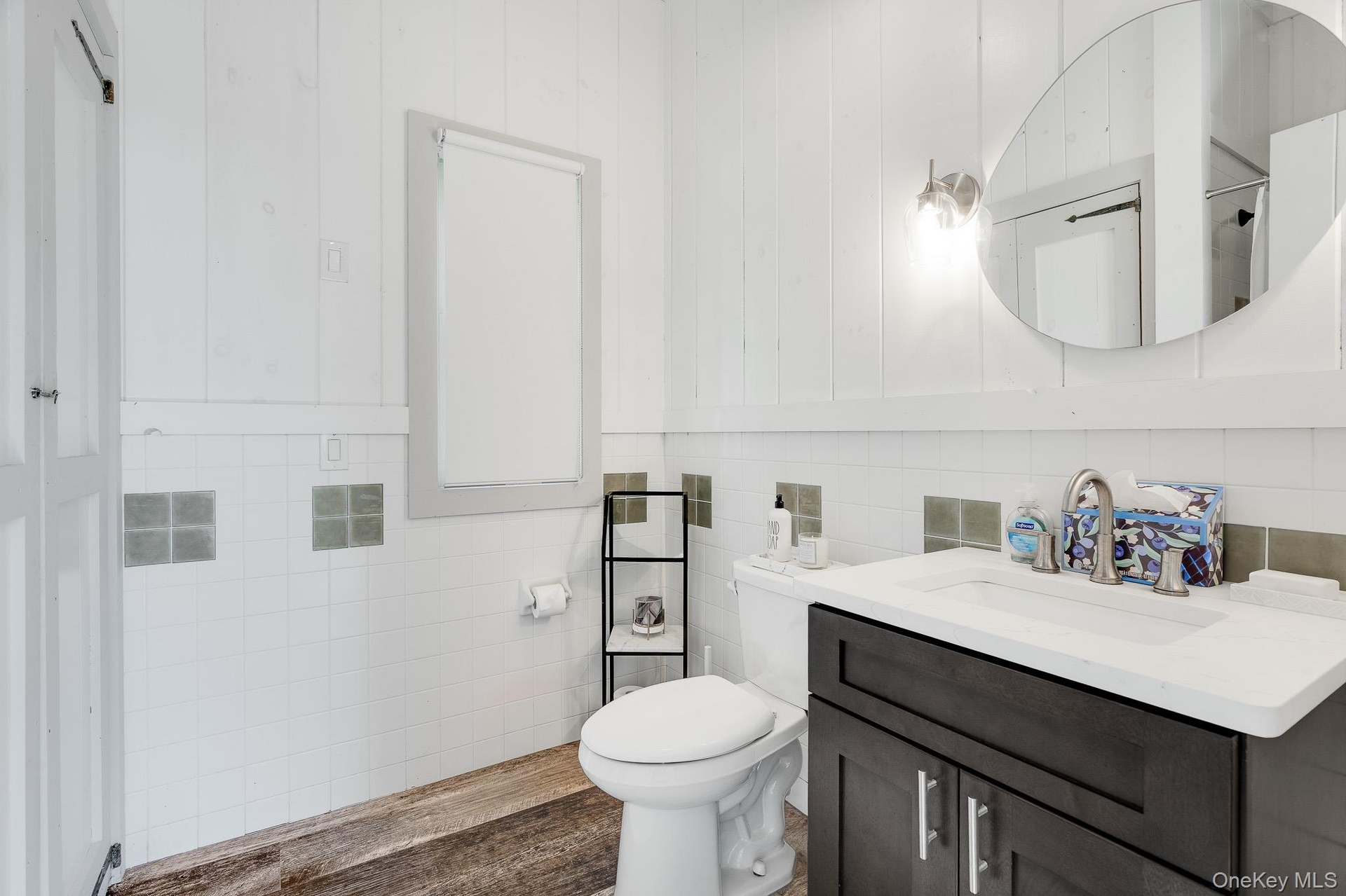 - Full bathroom with vanity, tile walls, and wood finished floors