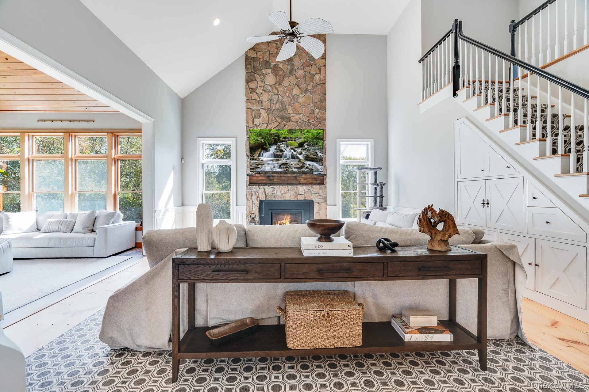 - Living room with high vaulted ceiling, a stone fireplace, ceiling fan, and stairs