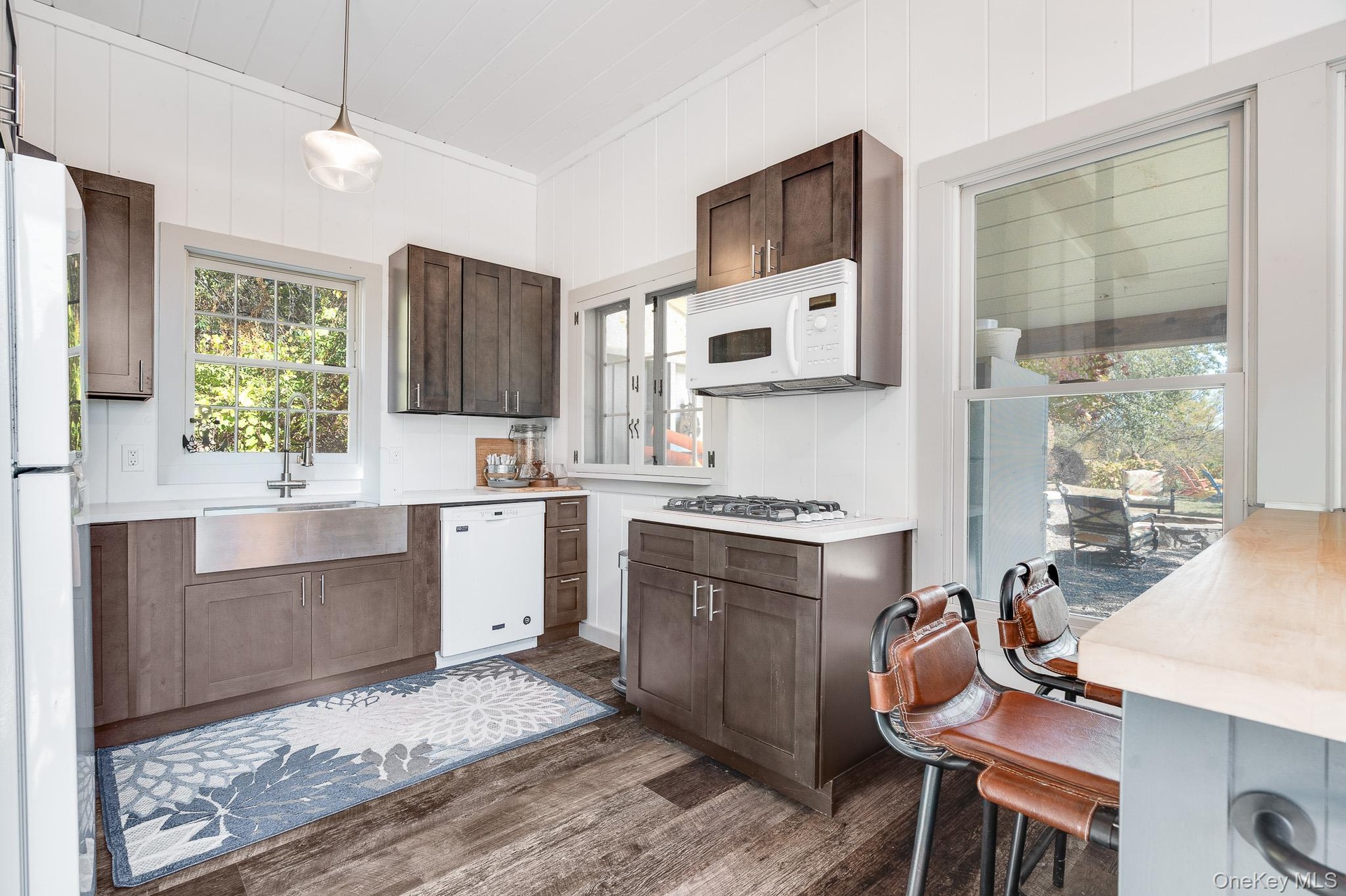 - Kitchen featuring light countertops, white appliances, dark wood-style flooring, hanging light fixtures, and dark brown cabinets