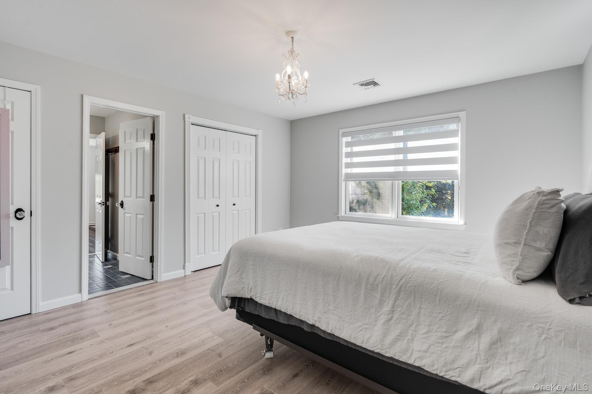 - Bedroom with wood finished floors, a closet, and a chandelier