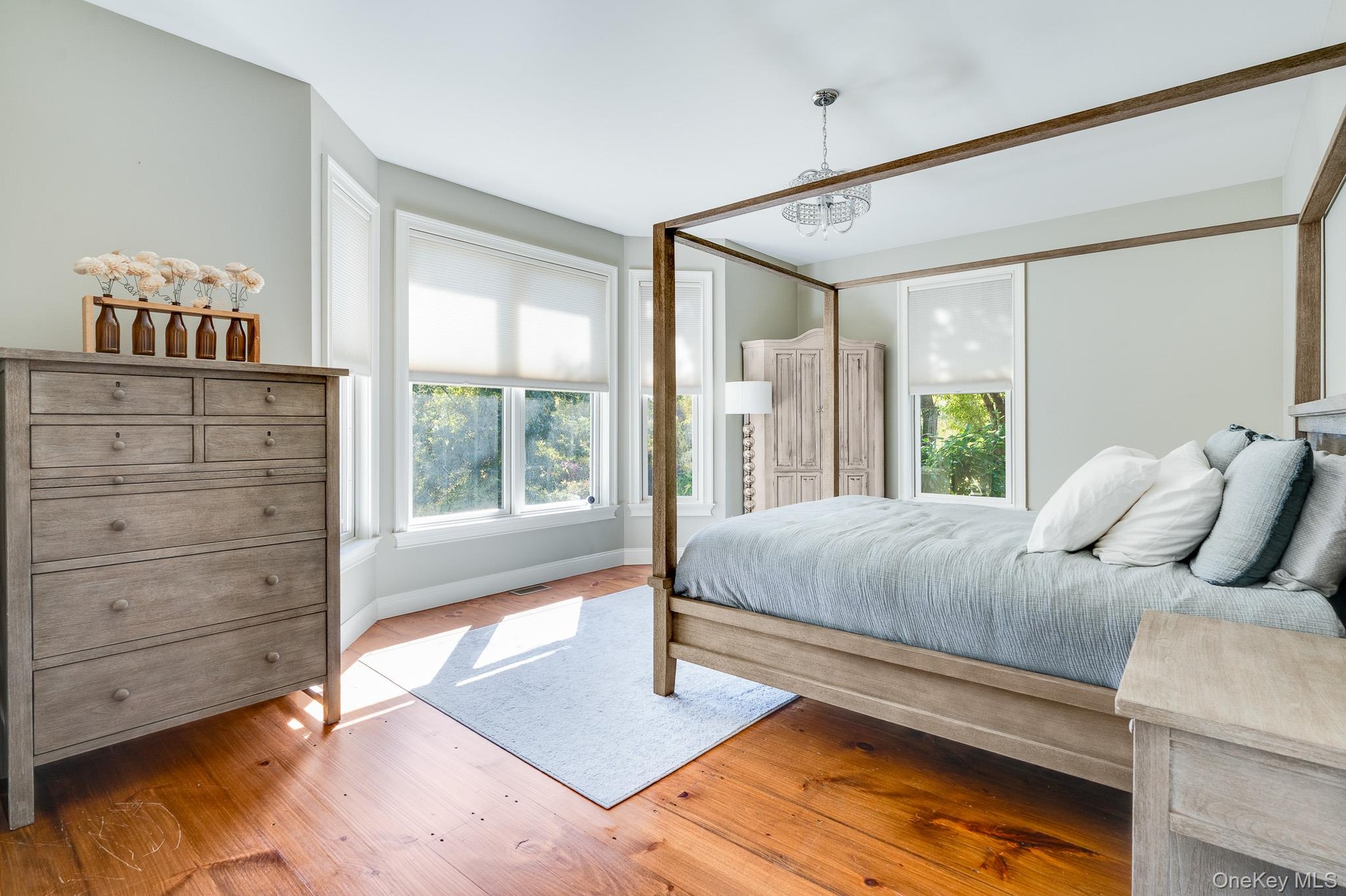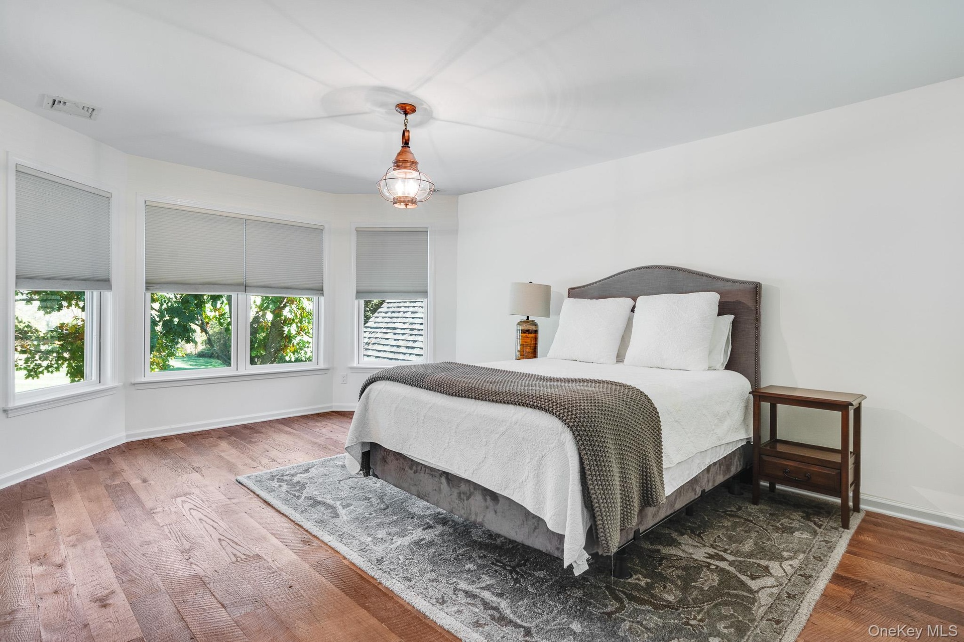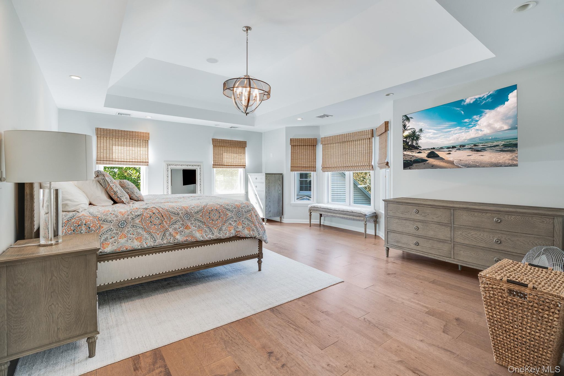 - Bedroom with multiple windows, a raised ceiling, light wood-type flooring, and recessed lighting