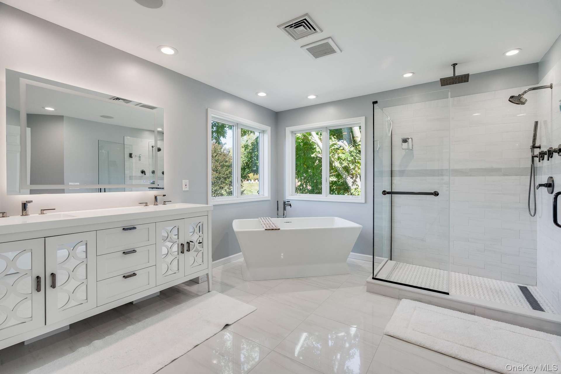 - Bathroom with a stall shower, double vanity, a freestanding bath, recessed lighting, and light tile patterned flooring