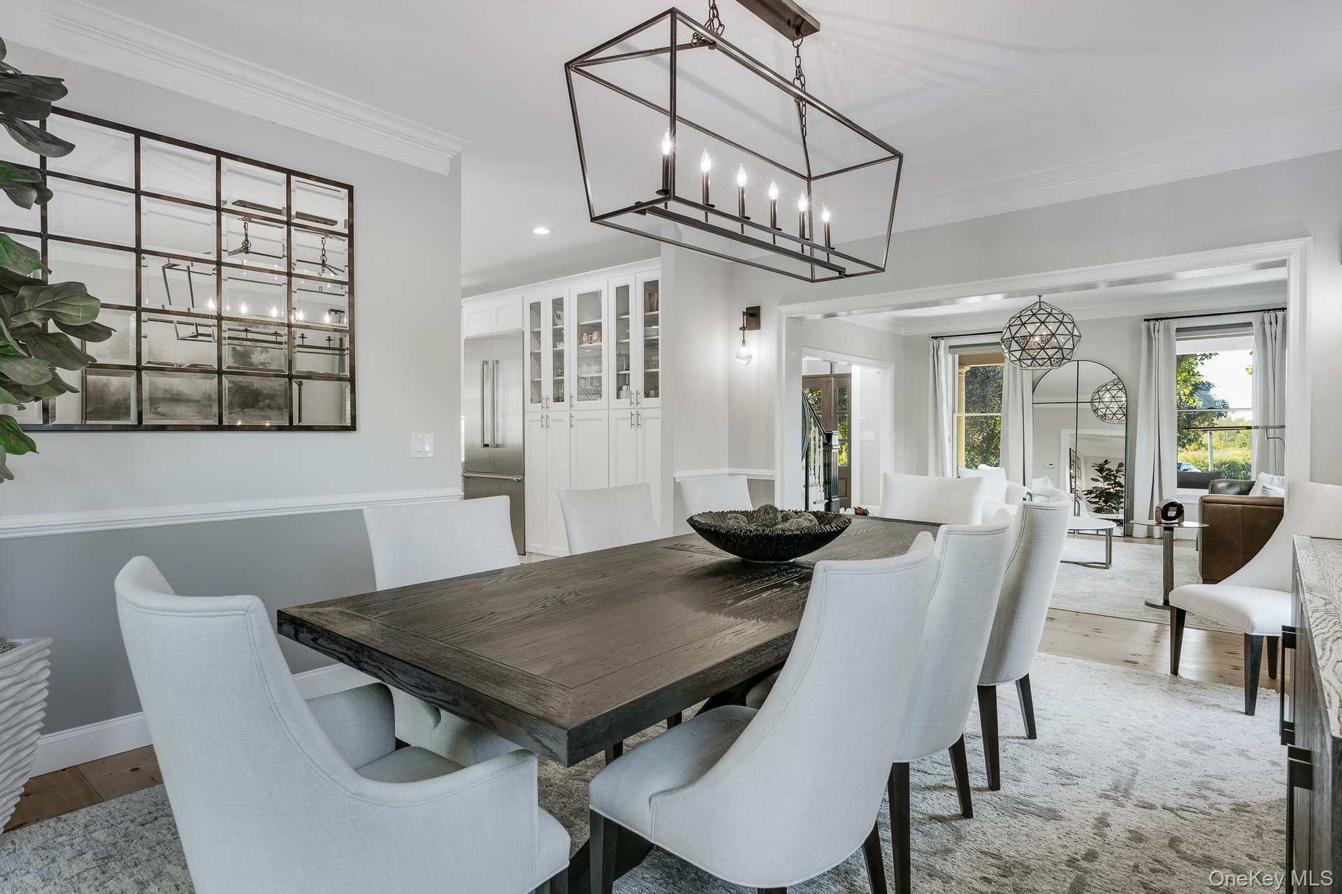 - Dining space with ornamental molding, light wood finished floors, a chandelier, and recessed lighting