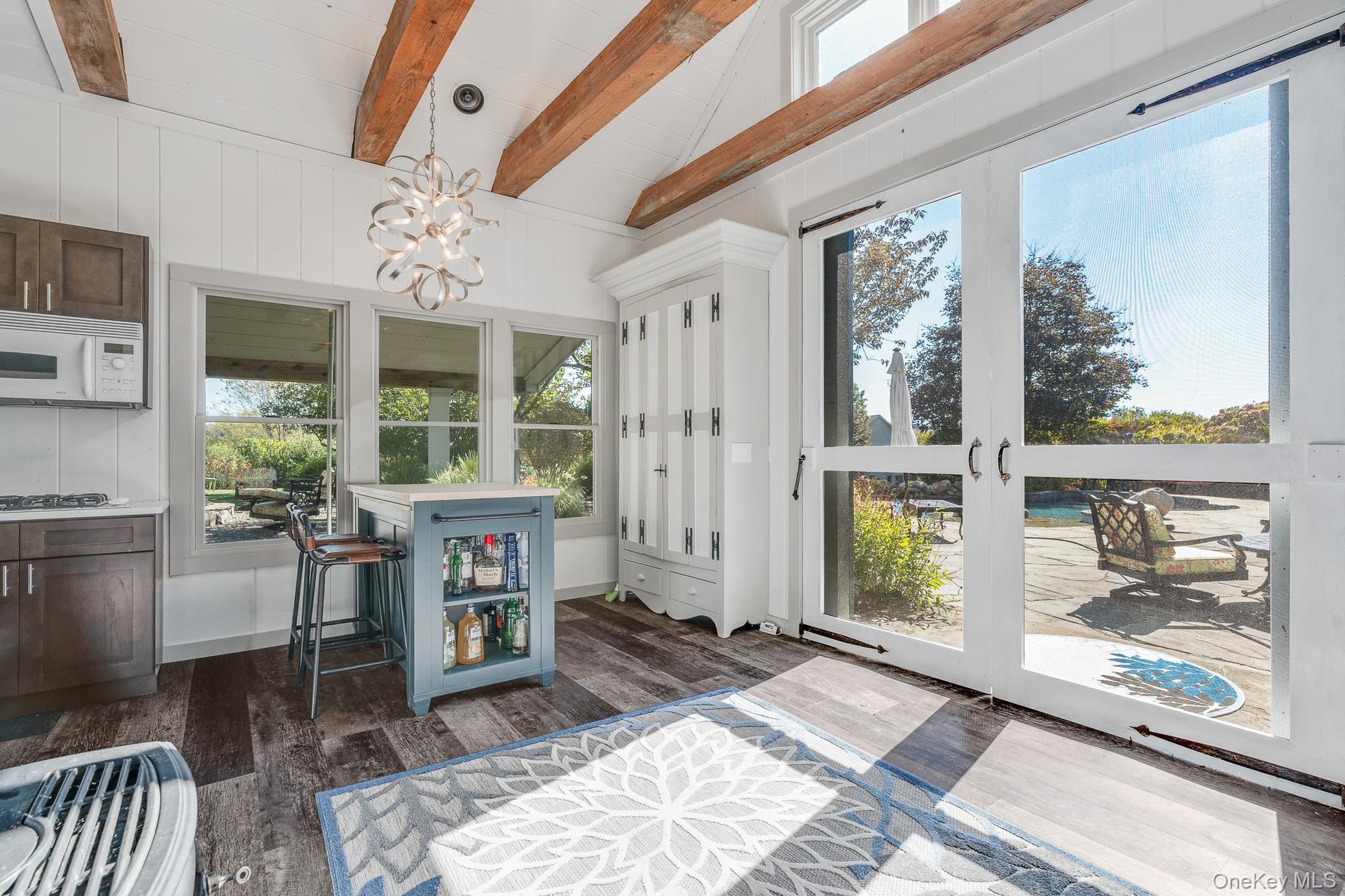 - Sunroom / solarium with healthy amount of natural light, beam ceiling, french doors, and a chandelier
