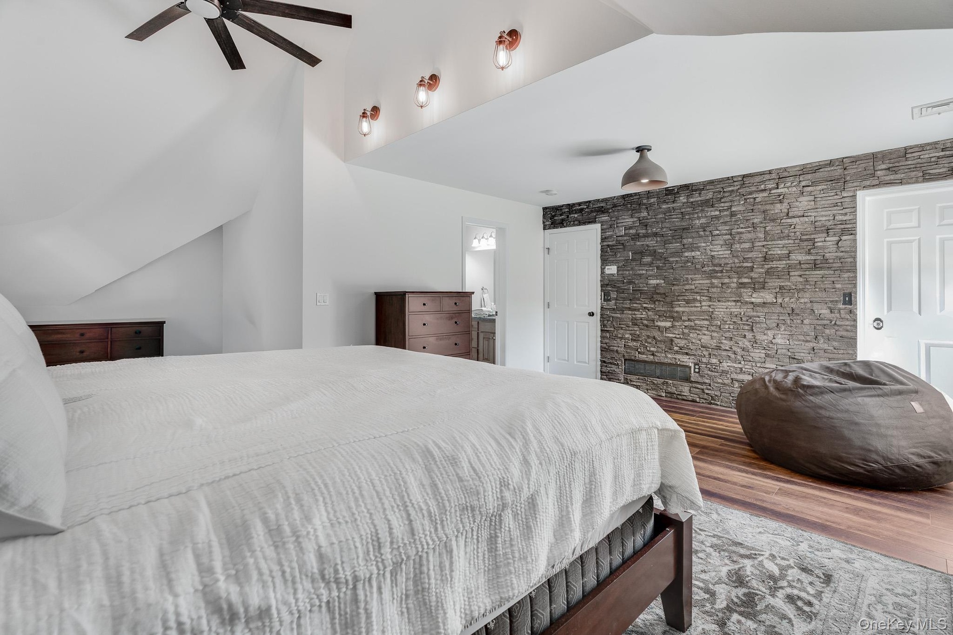 - Bedroom with wood finished floors, lofted ceiling, and ceiling fan