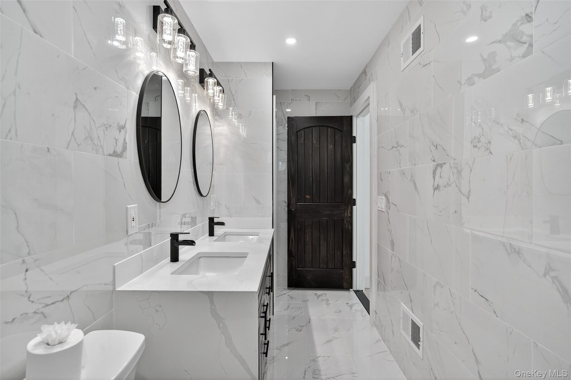 - Full bathroom with tile walls, double vanity, light marble finish floors, and recessed lighting