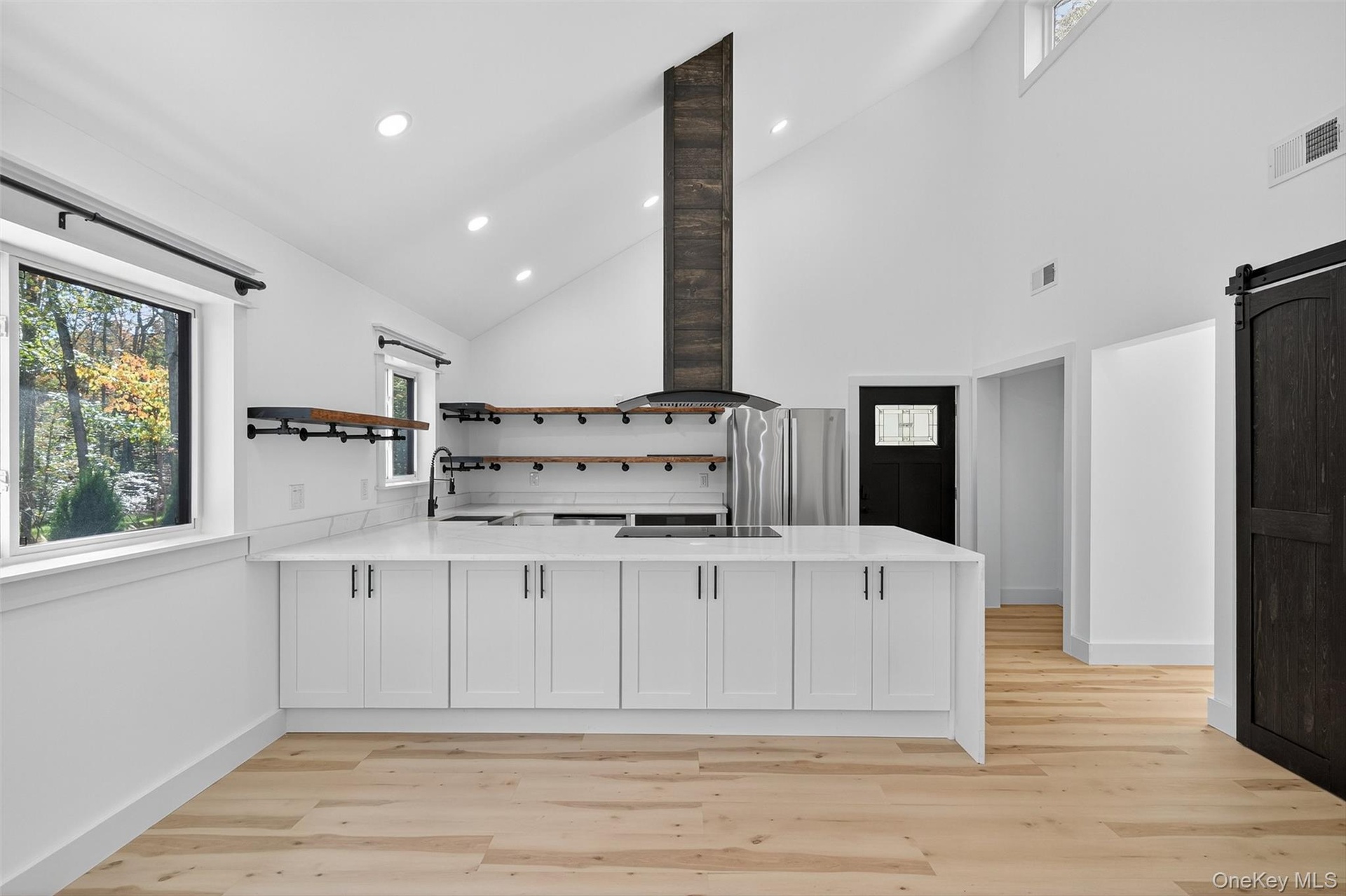 - Kitchen featuring a barn door, open shelves, light wood-style flooring, high vaulted ceiling, and a peninsula