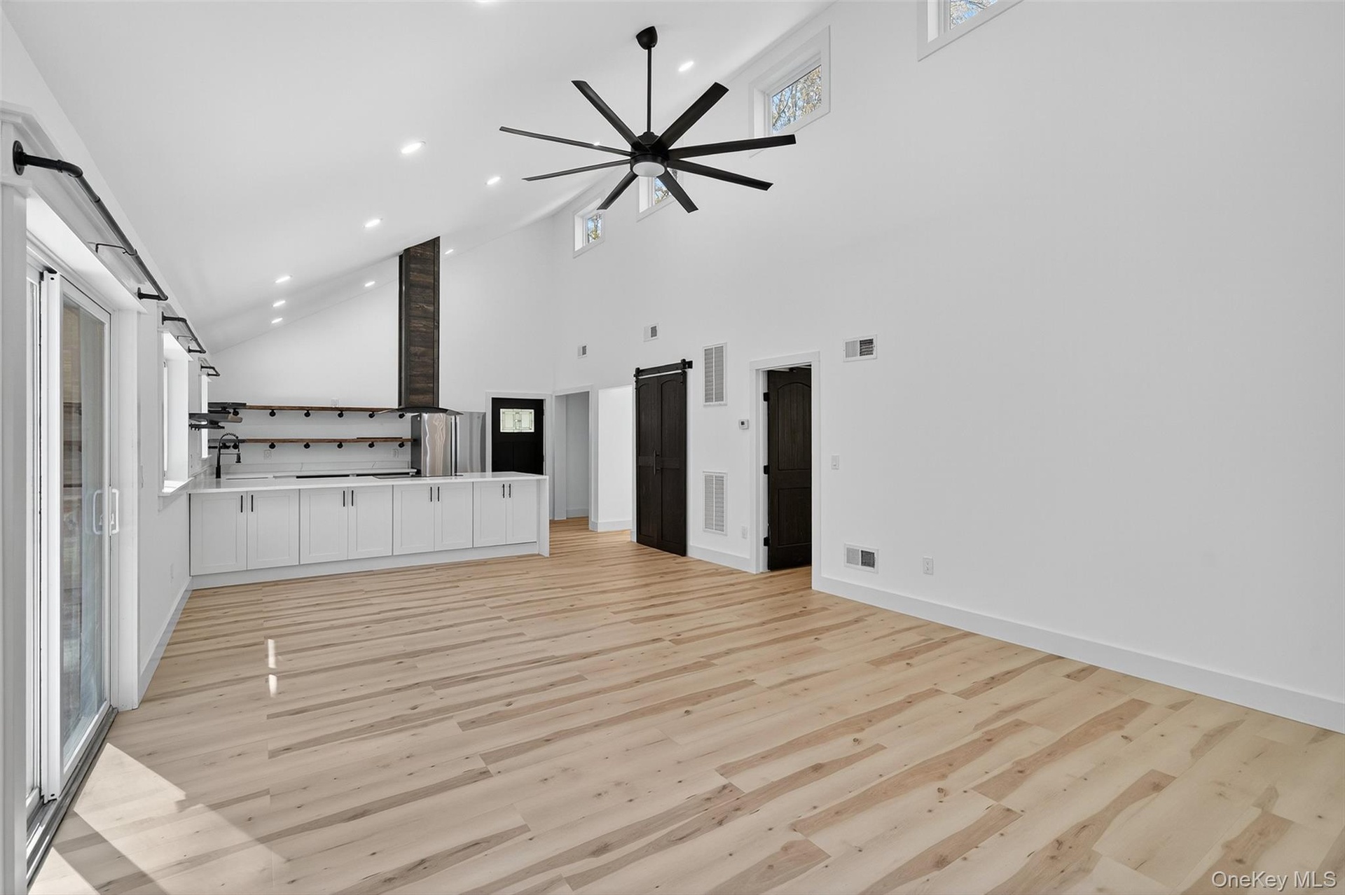 - Unfurnished living room featuring high vaulted ceiling, recessed lighting, light wood-style flooring, a barn door, and a ceiling fan