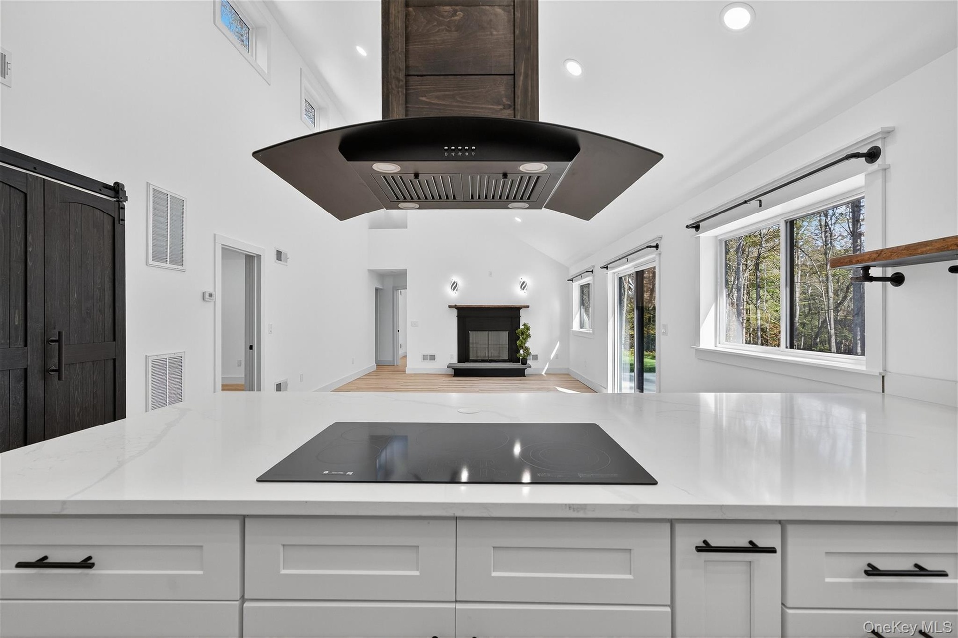 - Kitchen featuring a barn door, open shelves, plenty of natural light, light stone countertops, and high vaulted ceiling