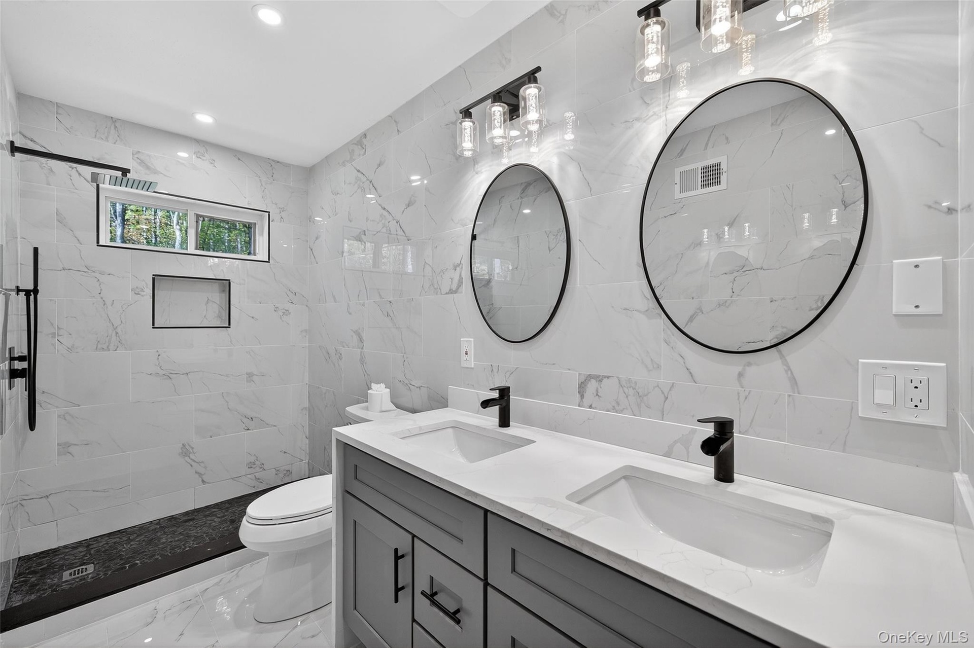 - Bathroom with a marble finish shower