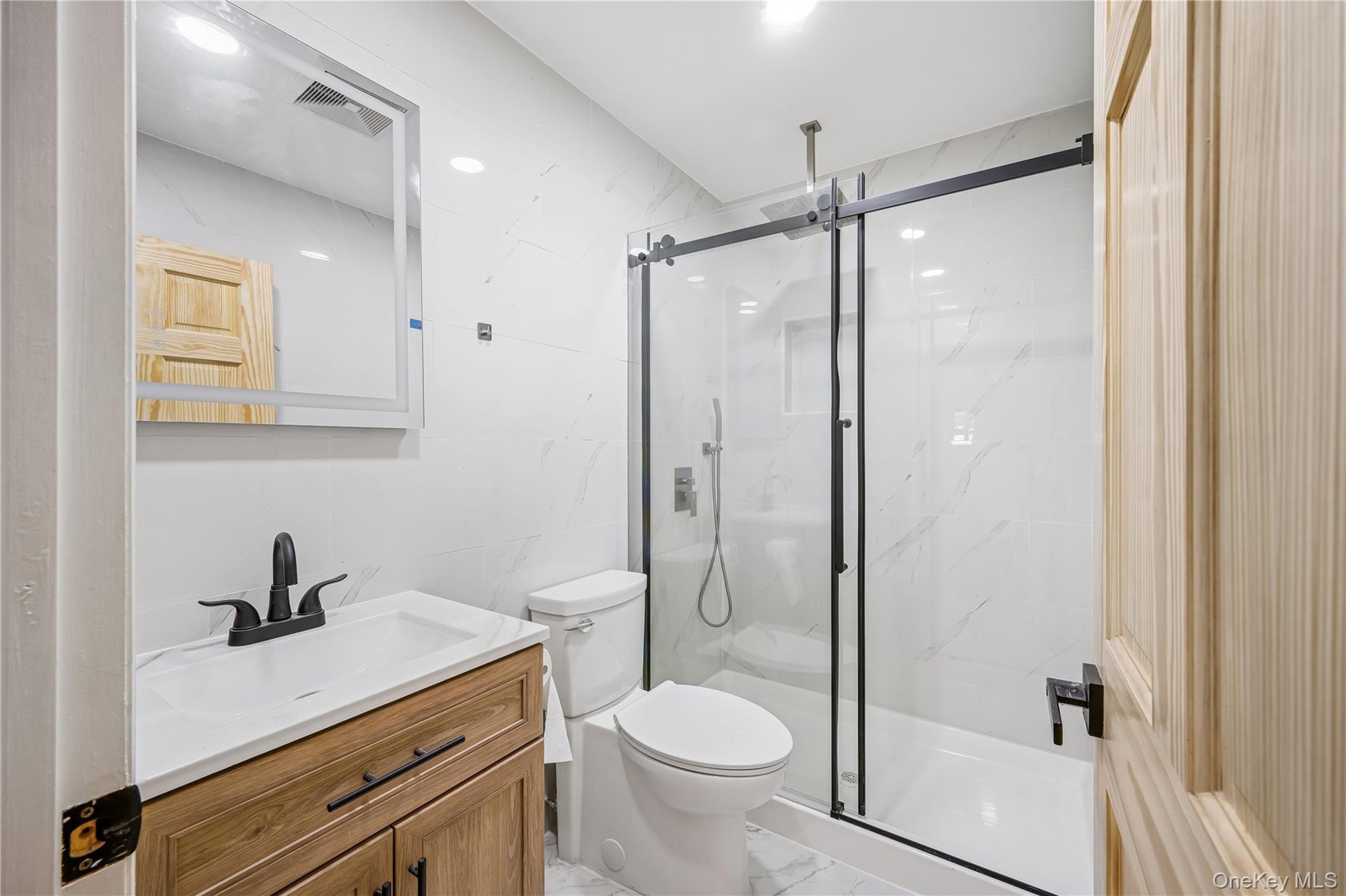 - Full bath with vanity, a marble finish shower, light marble finish flooring, tile walls, and recessed lighting