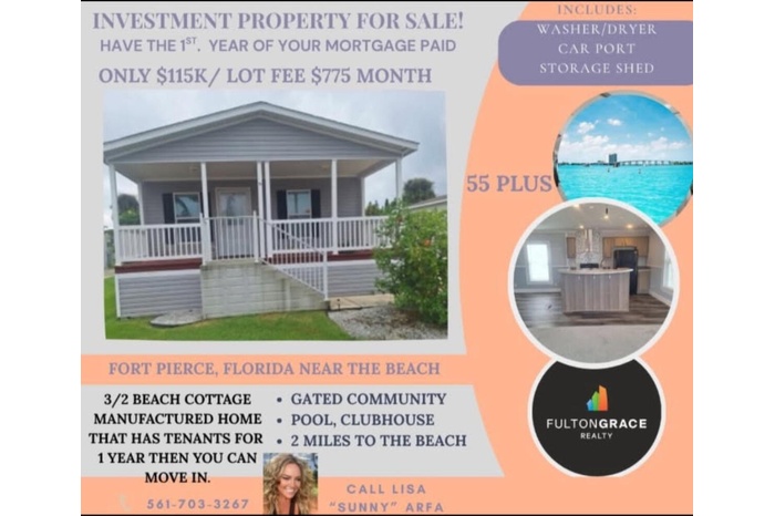 DescriptionINVESTORS DREAM! TENANTS ARE PAYING ALL THE BILLS FOR NEXT YEAR AND HALF. LOVELY 3/2 BEACH COTTAGE MANUFACTURED HOME! ENJOY THE INDIAN RIVER BREEZES ALL DAY ON THE COVERED PATIO. OPEN KITCHEN/LIVING AND DINING AREA. LOTS OF CLOSET SPACE. FRESH PAINT, NEW APPLIANCES, NEW CARPET. SHED AND CARPORT AND LOTS OF PARKING. GATED COMMUNITY, HEATED POOL YEAR ROUND, CLUBHOUSE, BILLIARDS AND CARD ROOM AND SMALL GYM. NICE SAFE QUIET NEIGHBORHOOD 2 MILES TO THE BEACH AND FUN AT FORT PIERCE MARINA BARS AND RESTAURANTS. $775 LOT FEE INCLUDES TAXES. INVESTOR CAN RENT UNLIMITED.