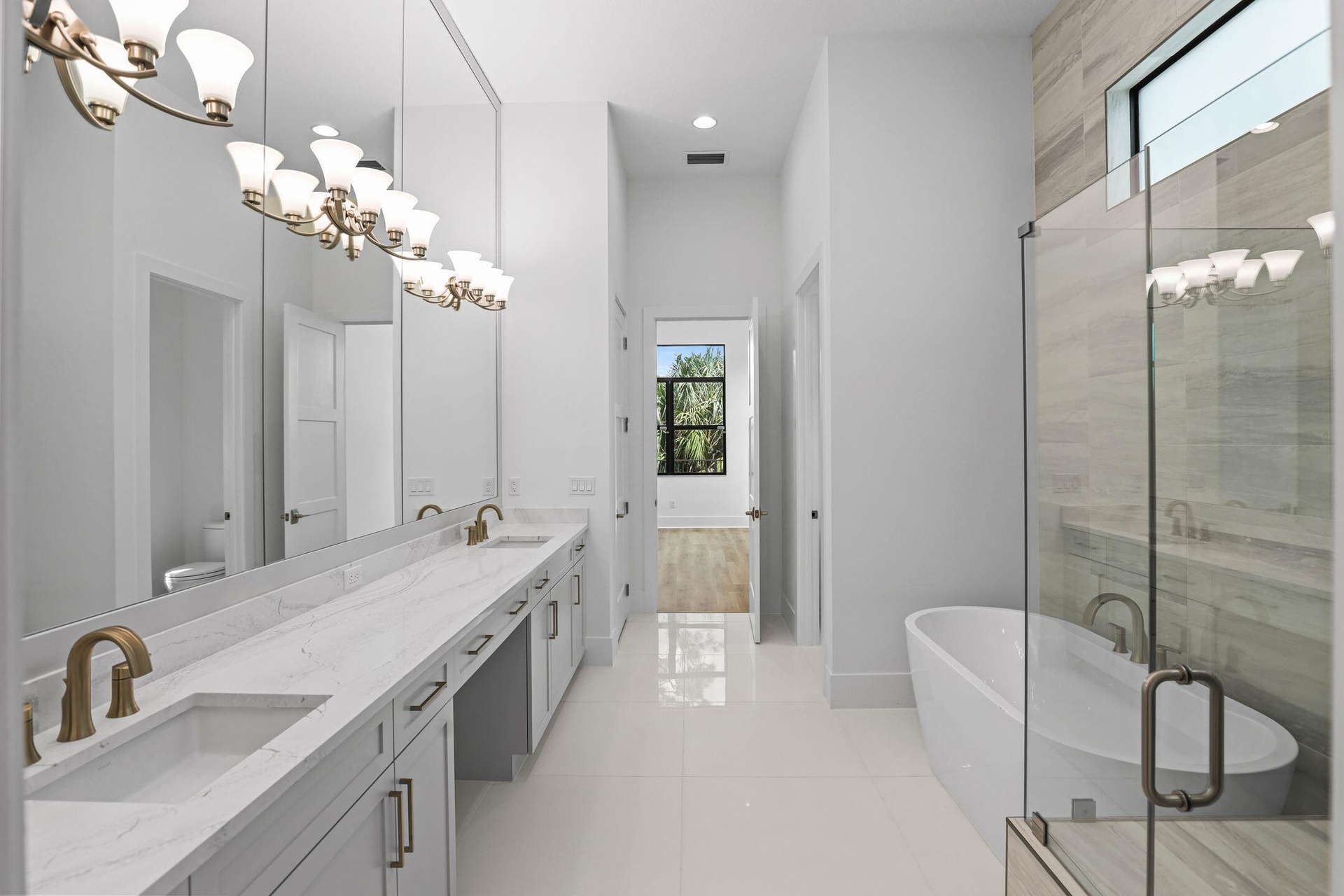 **New Construction - Move In Ready** This brand new Michelangelo floorplan with a custom pool is located within Artistry Palm Beach. This home offers 3 bedroom suites, each with their own bathroom, an additional half bathroom and a 3-car split garage. This Michelangelo also includes gas cooking in the kitchen, 2nd tier upper cabinets, quartz backsplash, 3'' edge quartz kitchen island and under cabinet LED lighting. The house has an expanded owners walk in closet, and expanded great room, and an owner's bath with freestanding tub. The home also includes a gas tankless water heater.
