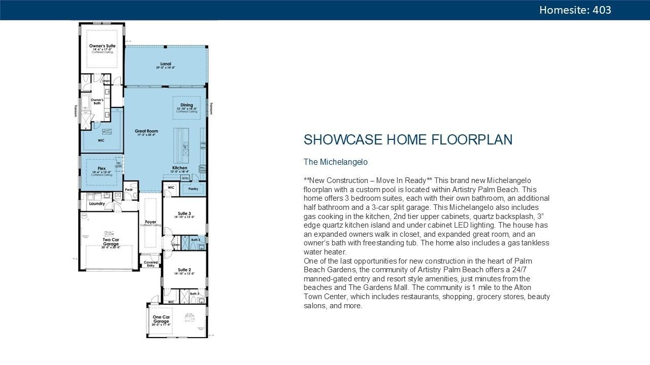 Description**New Construction - Move In Ready** This brand new Michelangelo floorplan with a custom pool is located within Artistry Palm Beach. This home offers 3 bedroom suites, each with their own bathroom, an additional half bathroom and a 3-car split garage. This Michelangelo also includes gas cooking in the kitchen, 2nd tier upper cabinets, quartz backsplash, 3'' edge quartz kitchen island and under cabinet LED lighting. The house has an expanded owners walk in closet, and expanded great room, and an owner's bath with freestanding tub. The home also includes a gas tankless water heater.