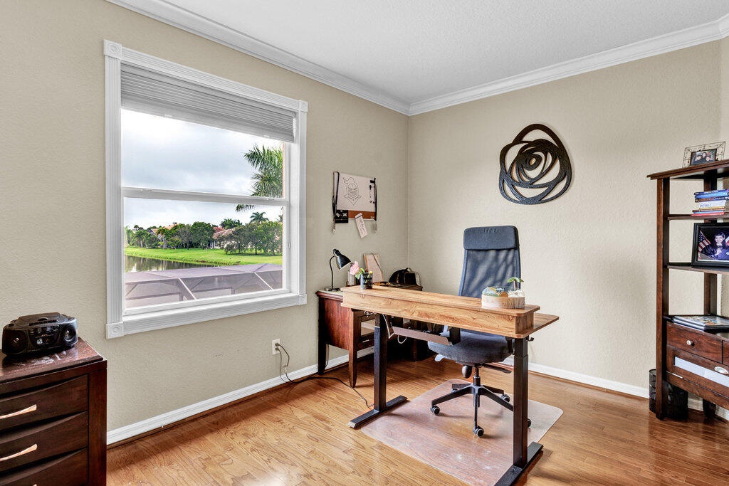 Welcome home to stunning lake views and custom upgrades. Every detail has been carefully curated from the inviting interior to the private outdoor oasis. Inside, you'll find a custom kitchen featuring granite, solid wood cabinetry, tile backsplash, and stainless steel appliances. The family room includes beautiful solid wood built-ins, while both the guest and primary baths showcase designer tile, solid wood vanities, and a stand-alone soaking tub. Step outside to enjoy incredible lake views from your pool situated on an estate-sized lot with 30+ feet between homes. This property offers exceptional space and privacy. Additional features include a whole house repipe, crown molding, chair rails, a custom pantry, hardwood stairs, and so much more. All boxes checked. See Virtual Tour.
