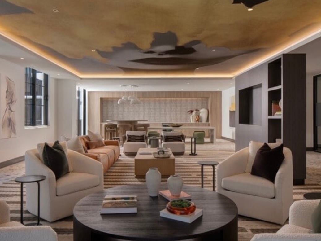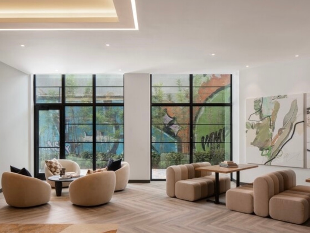 Residents can enjoy a host of amenities, including a state-of-the-art fitness center, a rooftop pool with stunning city views, and beautifully landscaped courtyards perfect for relaxation or social gatherings. The building's design incorporates elements of the local art scene, showcasing works from local artists throughout the common areas.