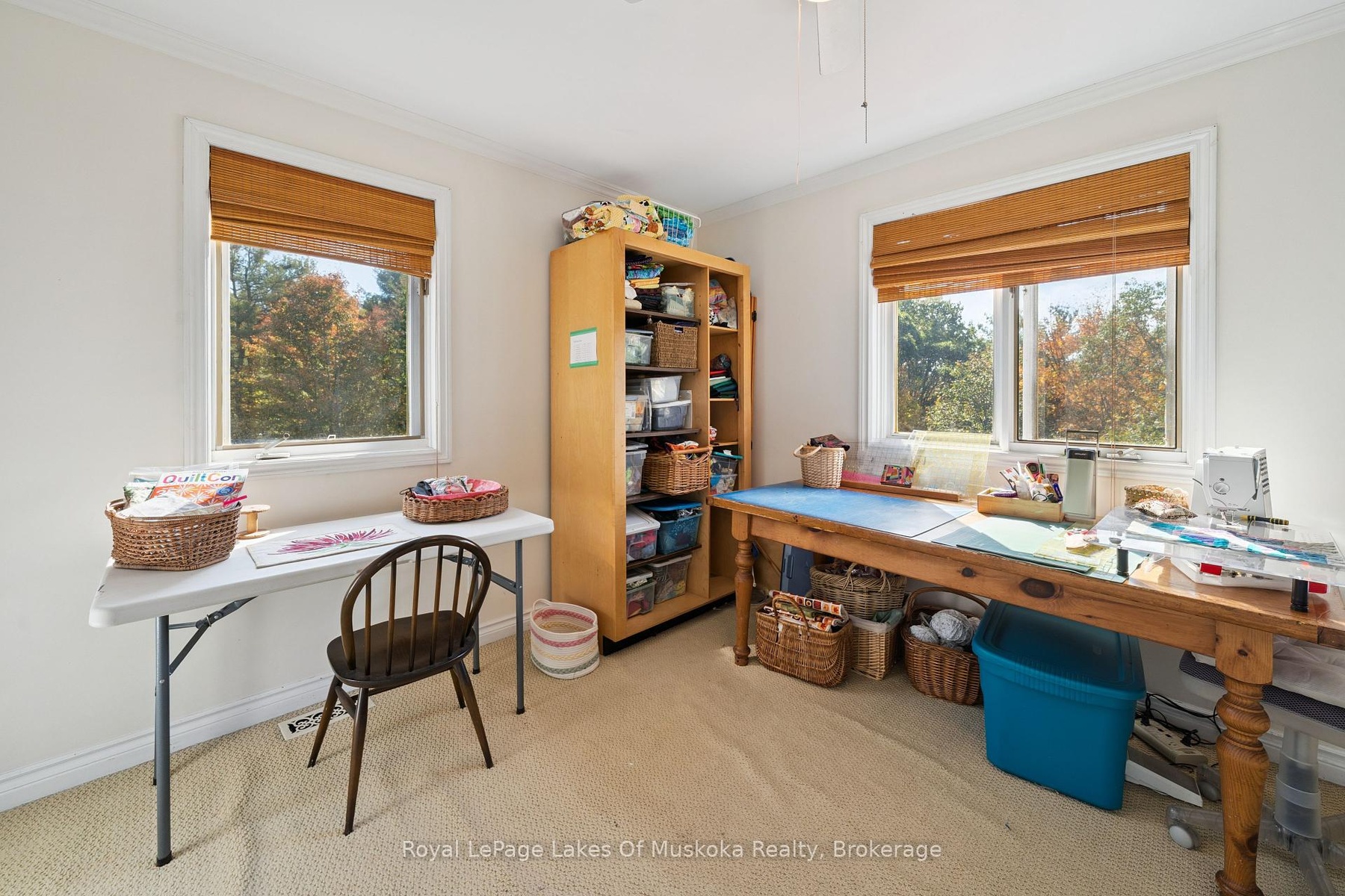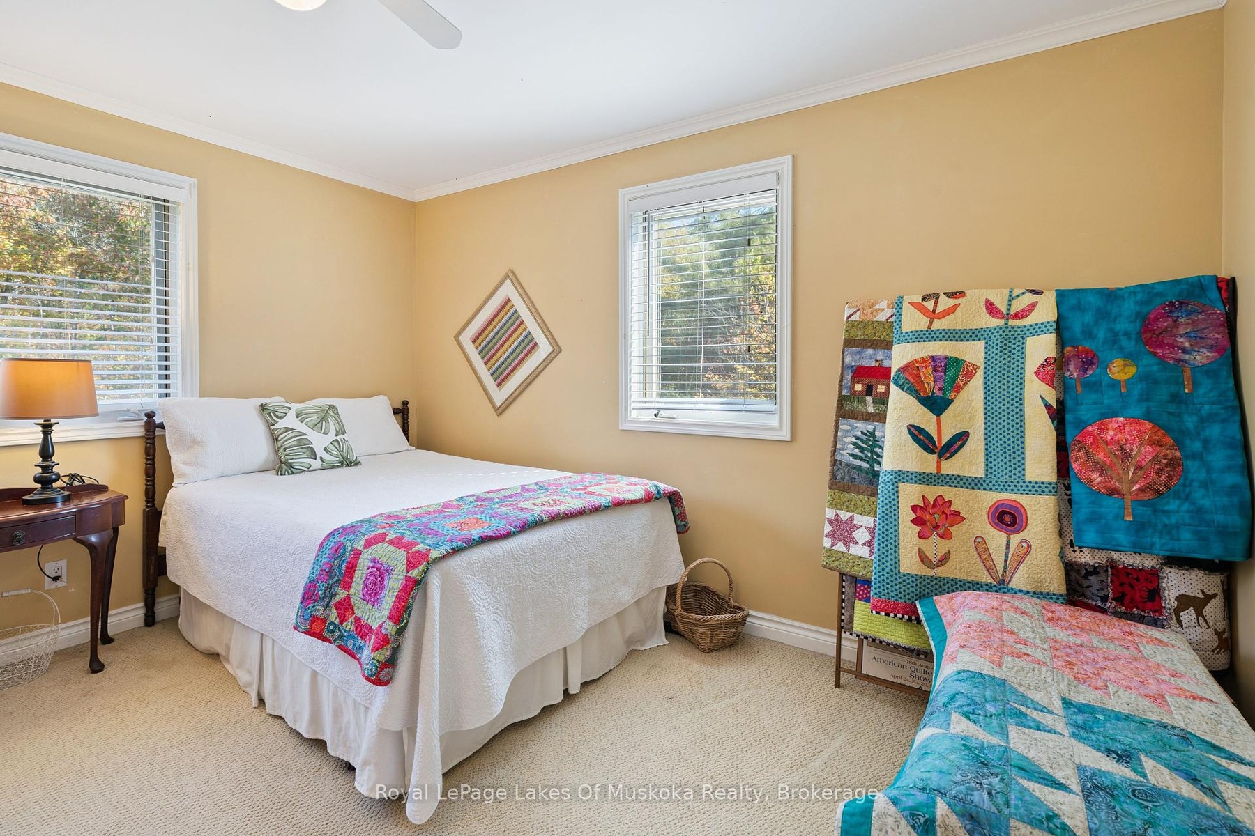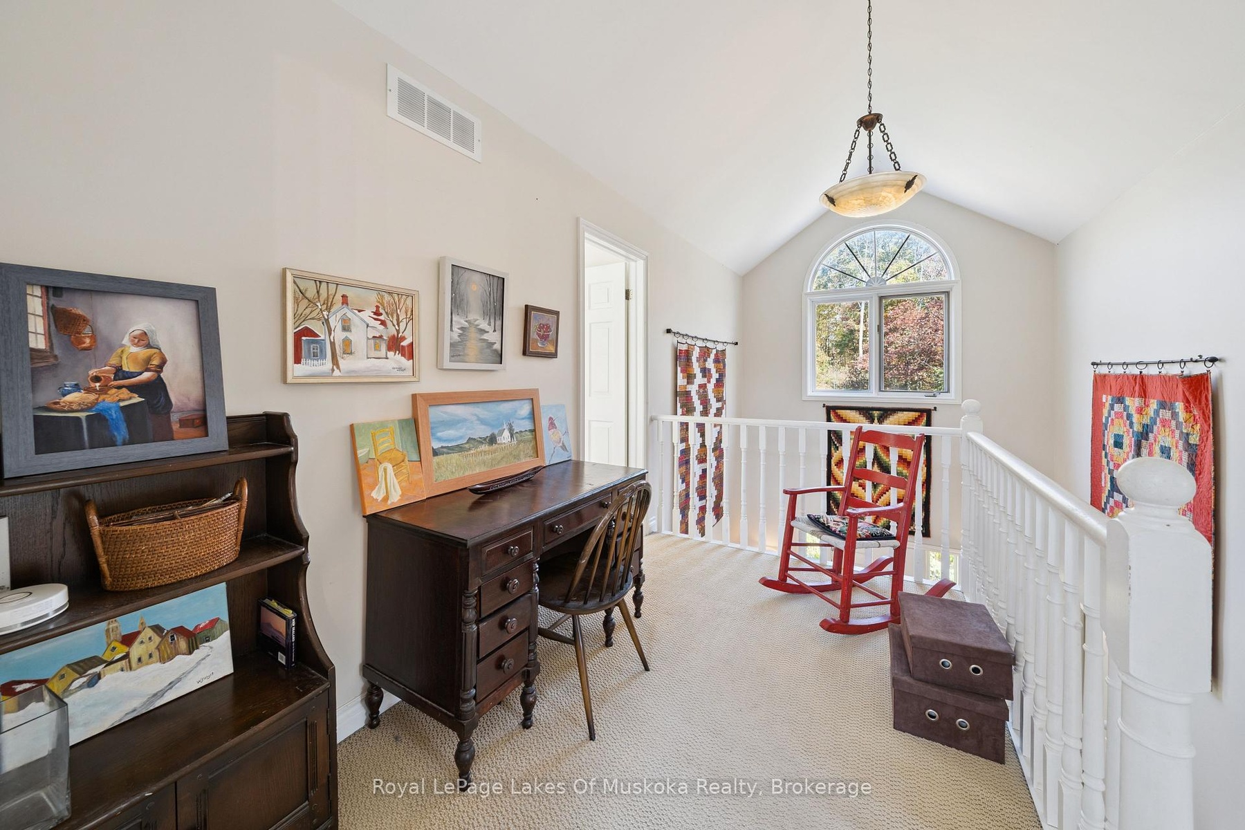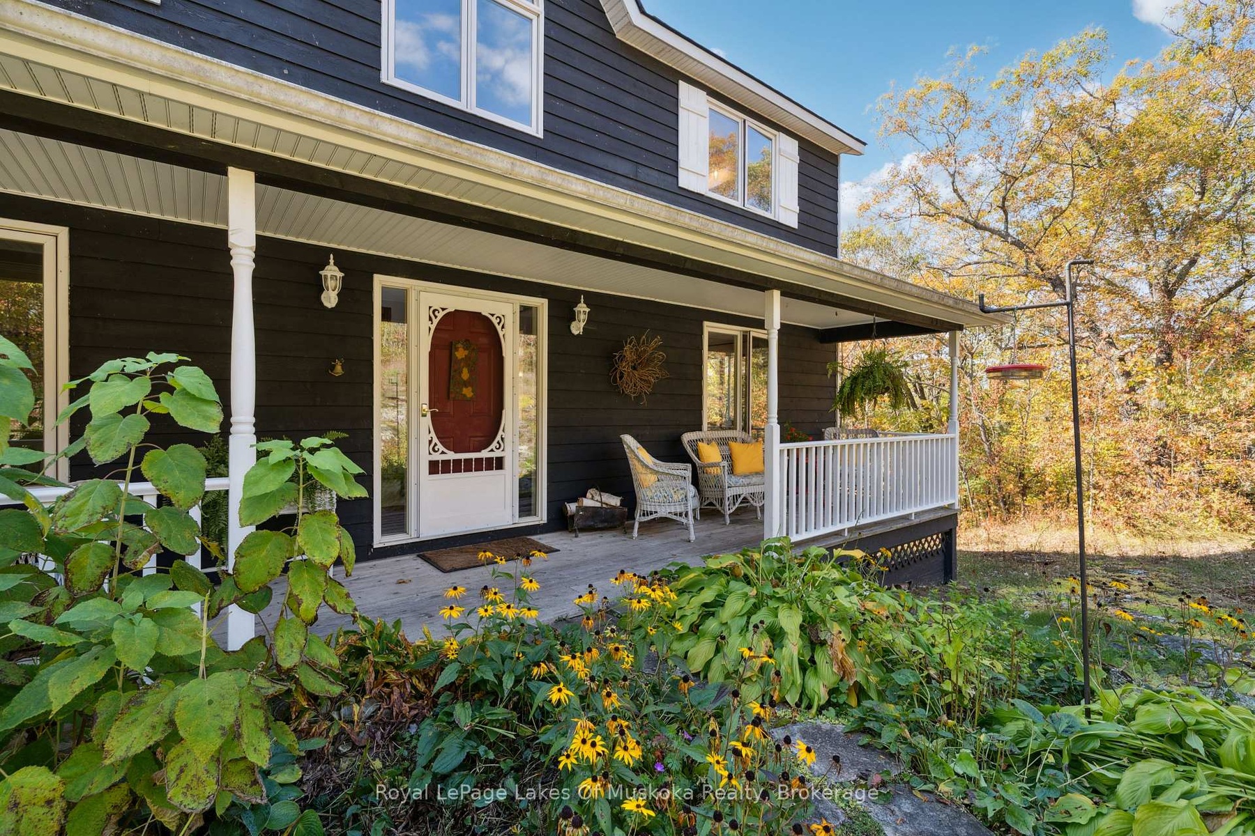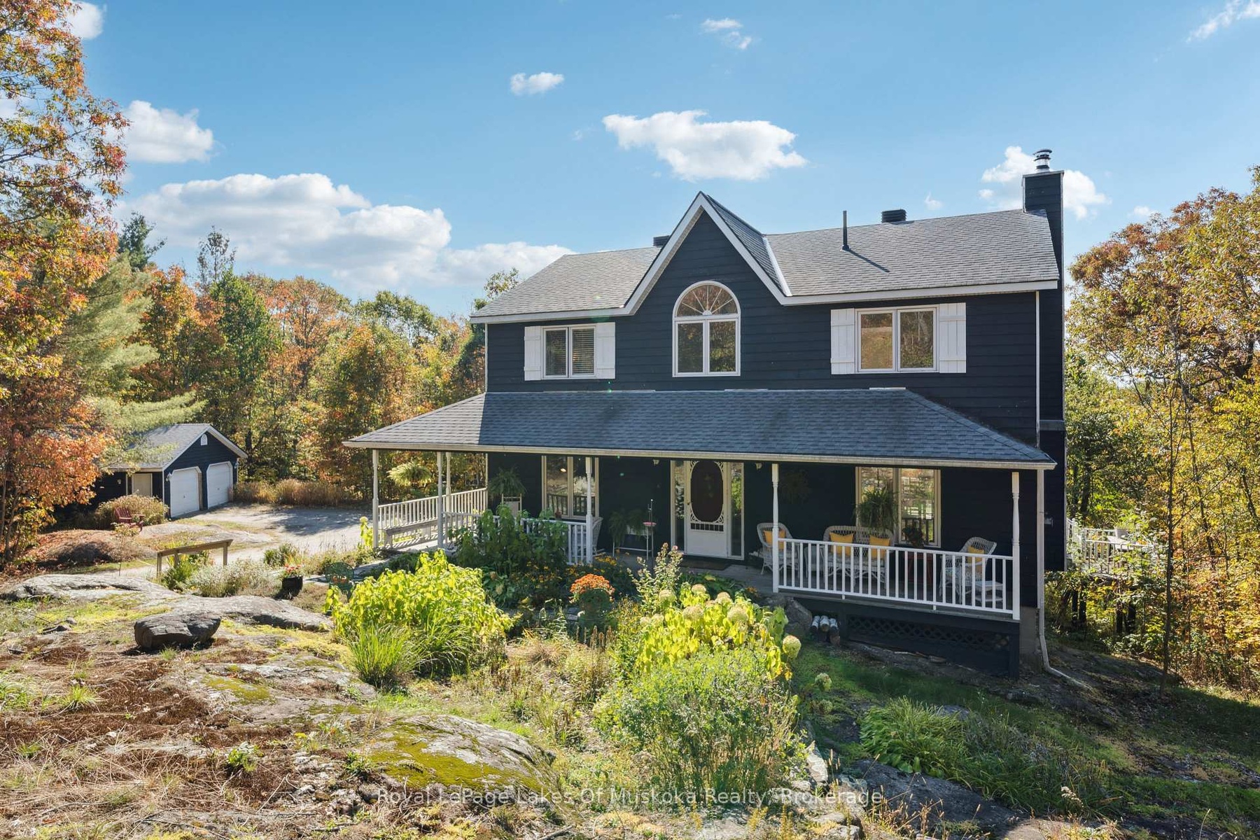 3-BDRM + DEN, 2.5 BATH, 1823 SQFT HOME ON 10 ACRES WITH DOUBLE GARAGE, JUST 6 MINUTES FROM IN-TOWN BRACEBRIDGE PLUS COLLECT OVER $220,000 IN PASSIVE INCOME OVER THE NEXT 15+ YEARS! Step through the covered front veranda into the foyer, complete with double closets. The main floor den provides a flexible space that can easily be adapted into an office, playroom, or an additional bedroom. The expansive living and dining area is bathed in natural light, featuring a wood-burning fireplace and direct access to the wrap-around deck. The eat-in kitchen includes a peninsula with a breakfast bar. A laundry closet and a side-entrance mudroom with a two-piece bathroom add to the home's practicality. The second floor features a large primary bedroom suite with a walk-in closet, a five-piece ensuite with a jetted tub, and a private balcony. Two more bedrooms and a spacious four-piece bathroom complete this level. The property sits on 10-acres of unique landscape of rock outcrops and mature forest, providing exceptional privacy and trails to explore. A detached, 23 x 23 double garage with a concrete floor and hydro can serve as a great workshop. The basement, with its exterior access under the deck, is perfect for storage and houses the home's utilities. This home is conveniently located just six minutes from the shops, restaurants, and entertainment in Bracebridge. It's also only 3-minutes from a Lake Muskoka marina and 1-minute from The Fairways at Kirrie Glen. * * * BONUS * * * Collect over $220,000 in passive income over the next 15 years! Bell Mobility leases a small part of the property for a cell tower and pays over $1000-$1300 each month. The tower can not be seen from the house. The property is still yours to enjoy as you desire.