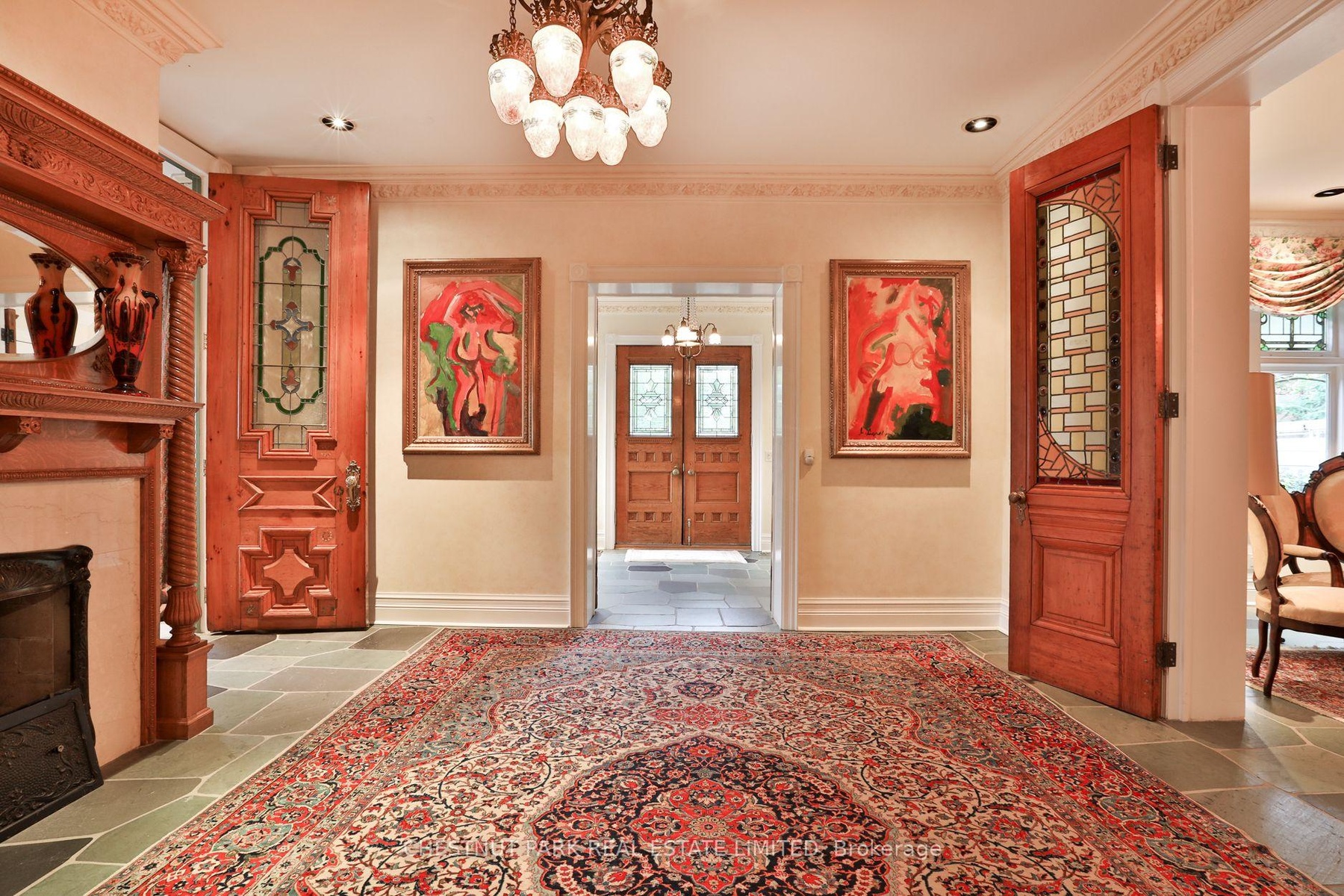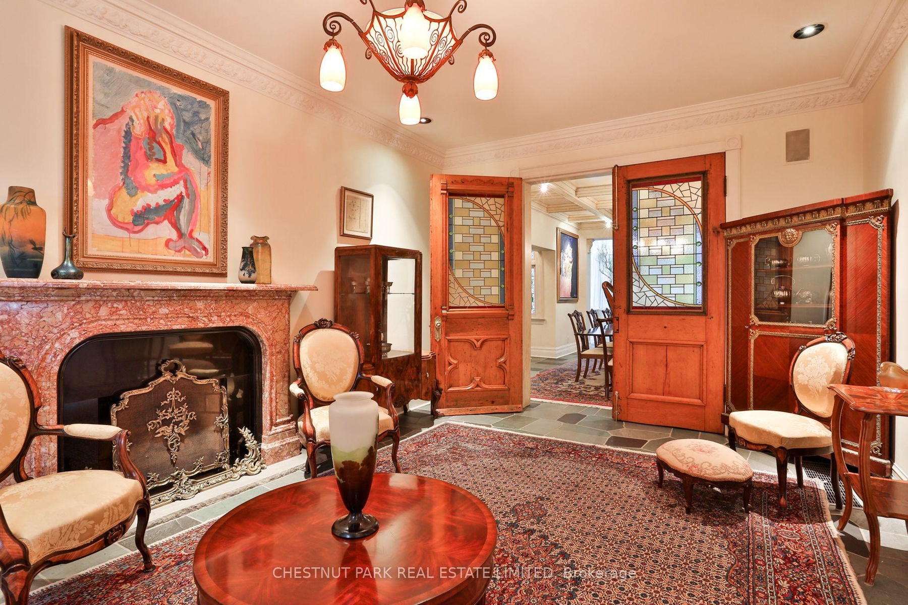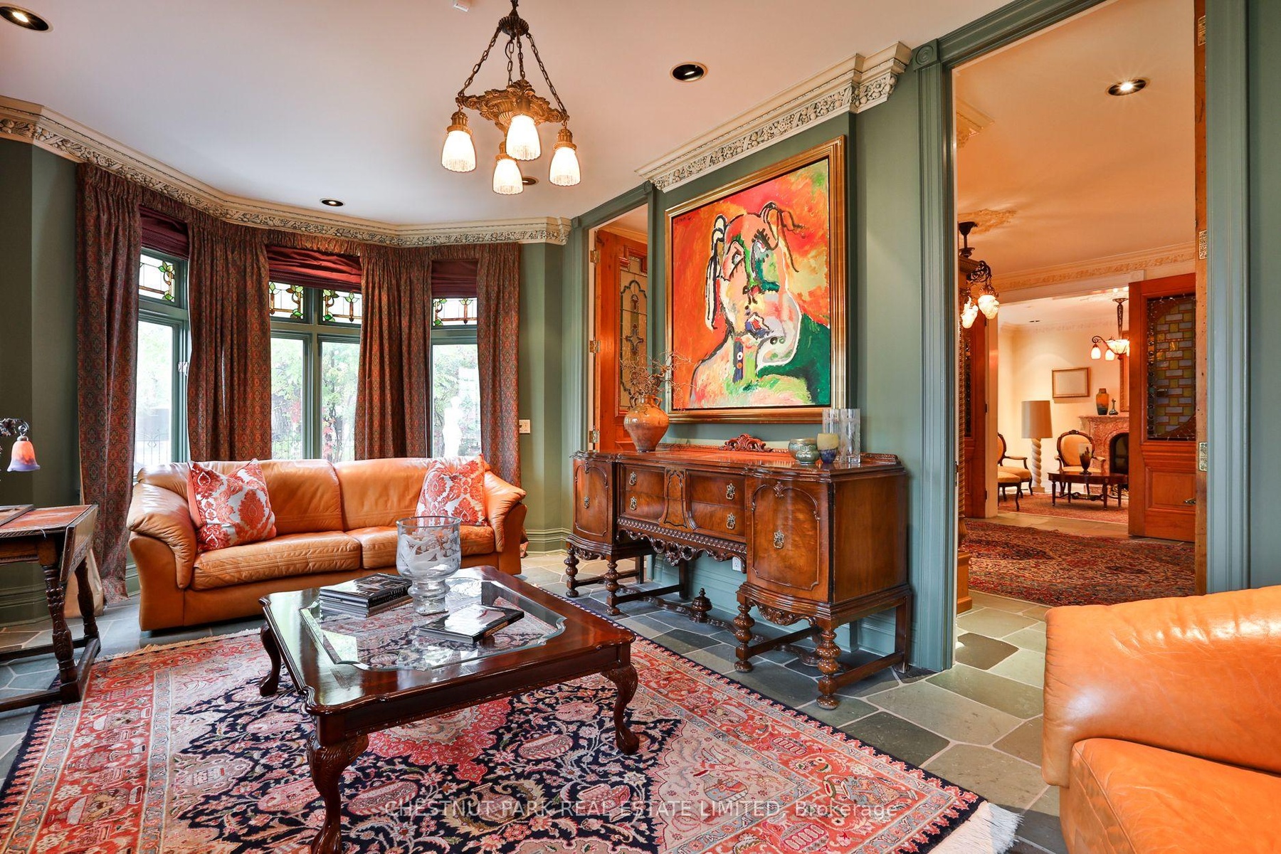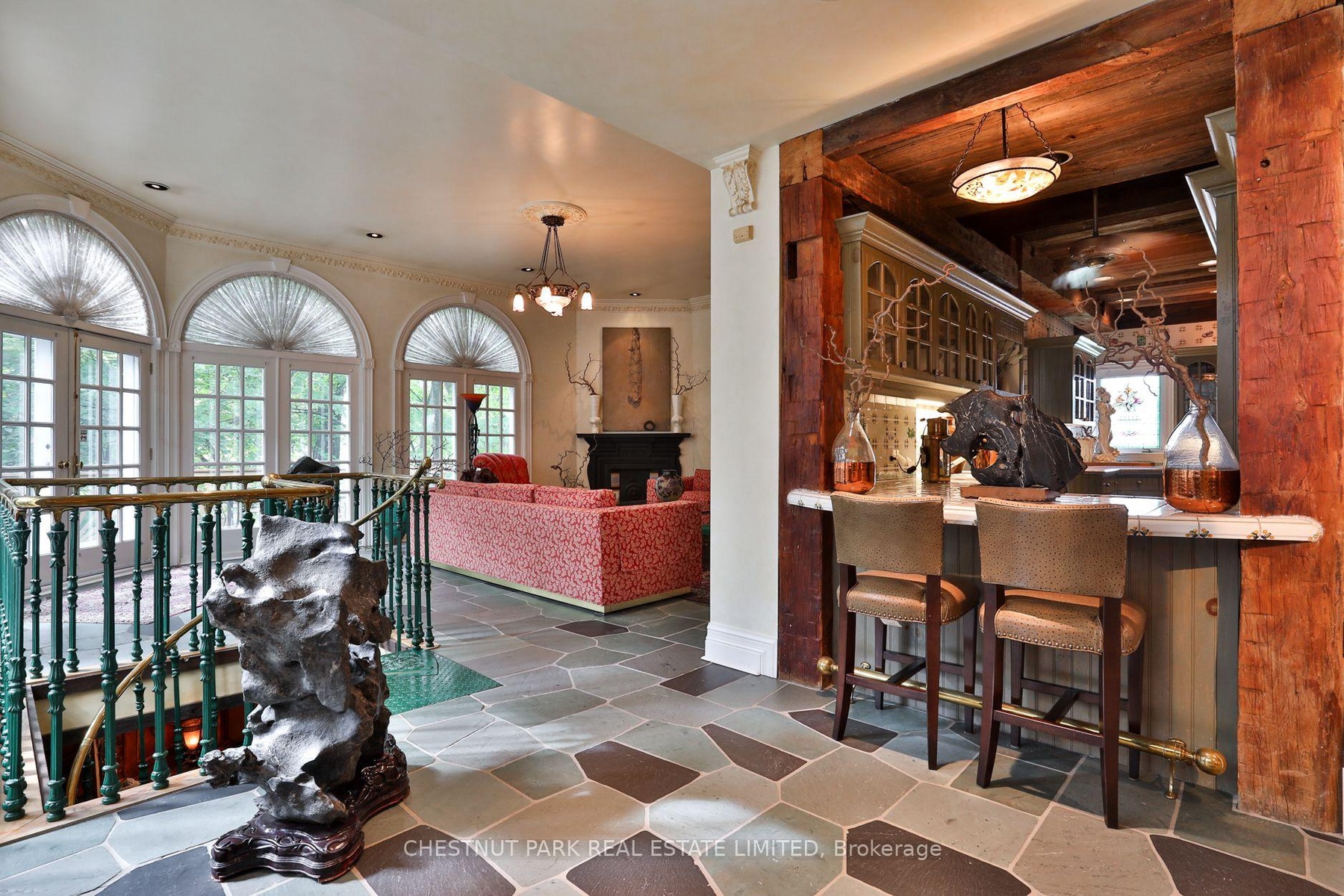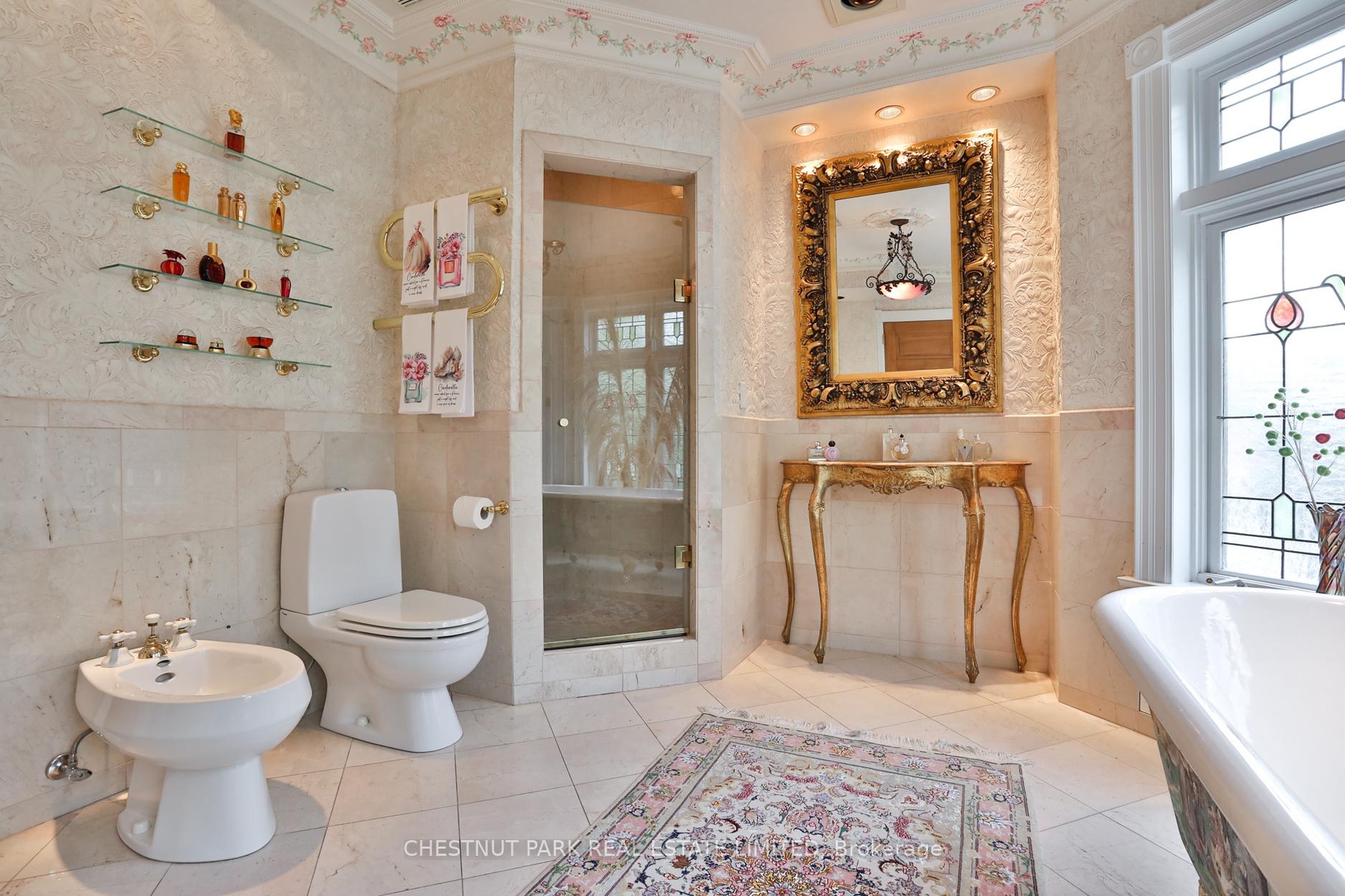 One of a kind old world European vibe. Over 7,000 square feet of incredible character filled space with 7 car gated parking. A unique blend of Ralph Lauren mixed with Aspen, Cabbagetown, Riverdale, the Annex and Rosedale. 4 gas fireplaces on main imported from Europe, 9 foot stained glass doors. Columns, pillars, high ceilings, 6 bedrooms, 6 bathrooms, an incredible chef's kitchen with aga stove and barbeque. Island warming ovens. Tranquil private ravine 245 ft in back with 2 tiered decks. Double car built-in garage.