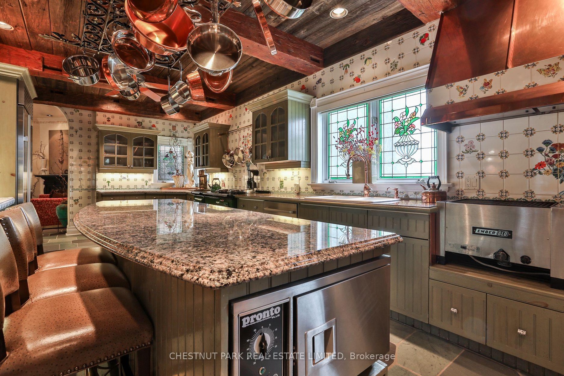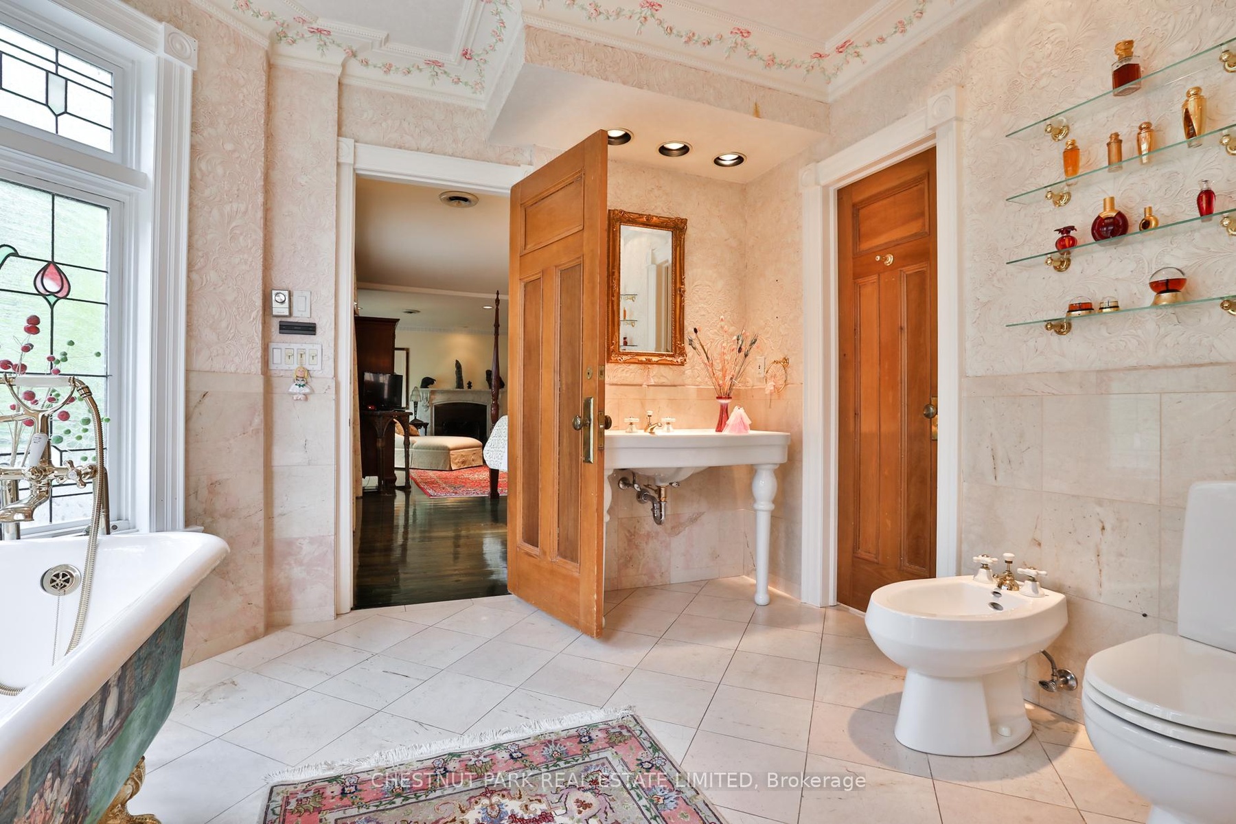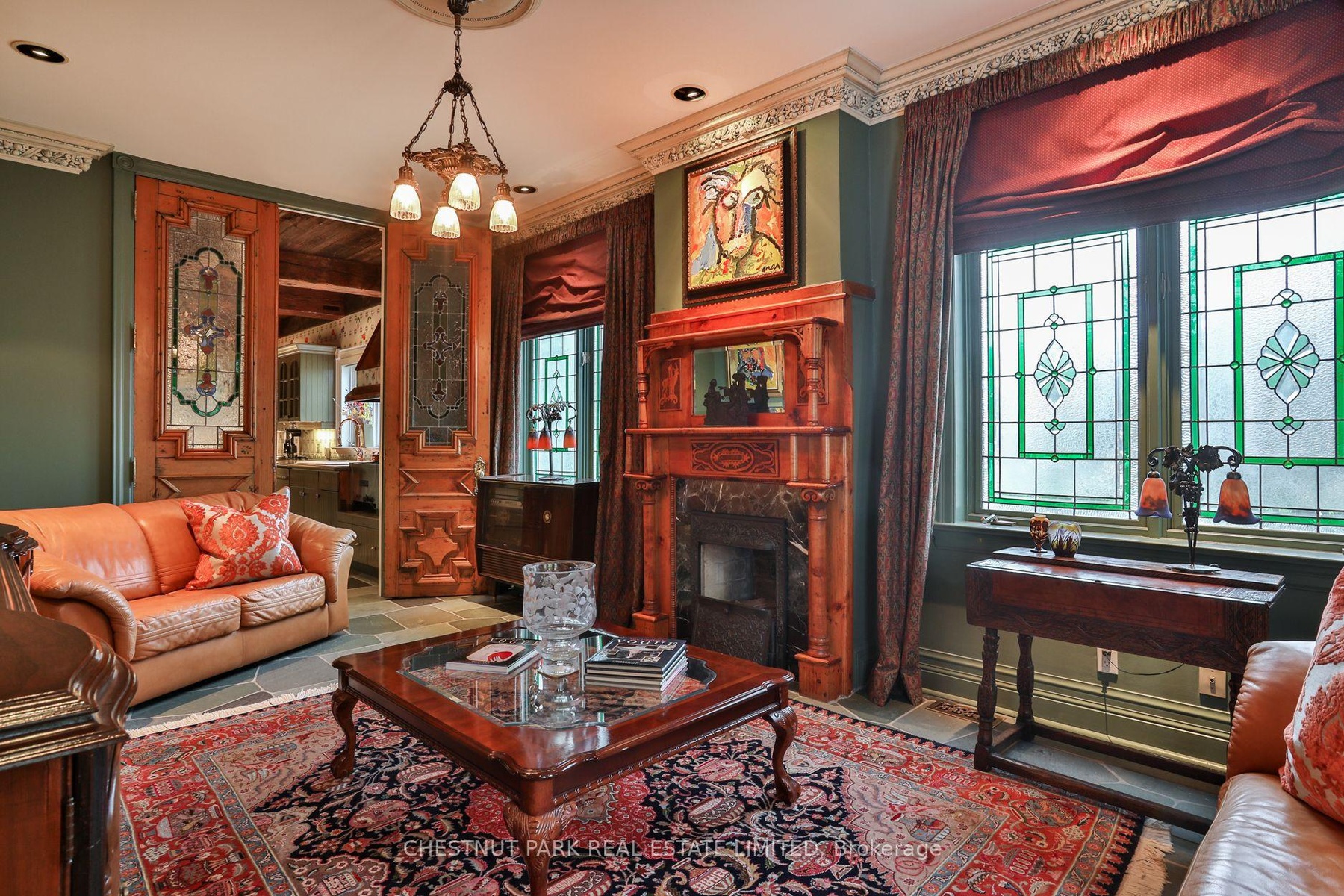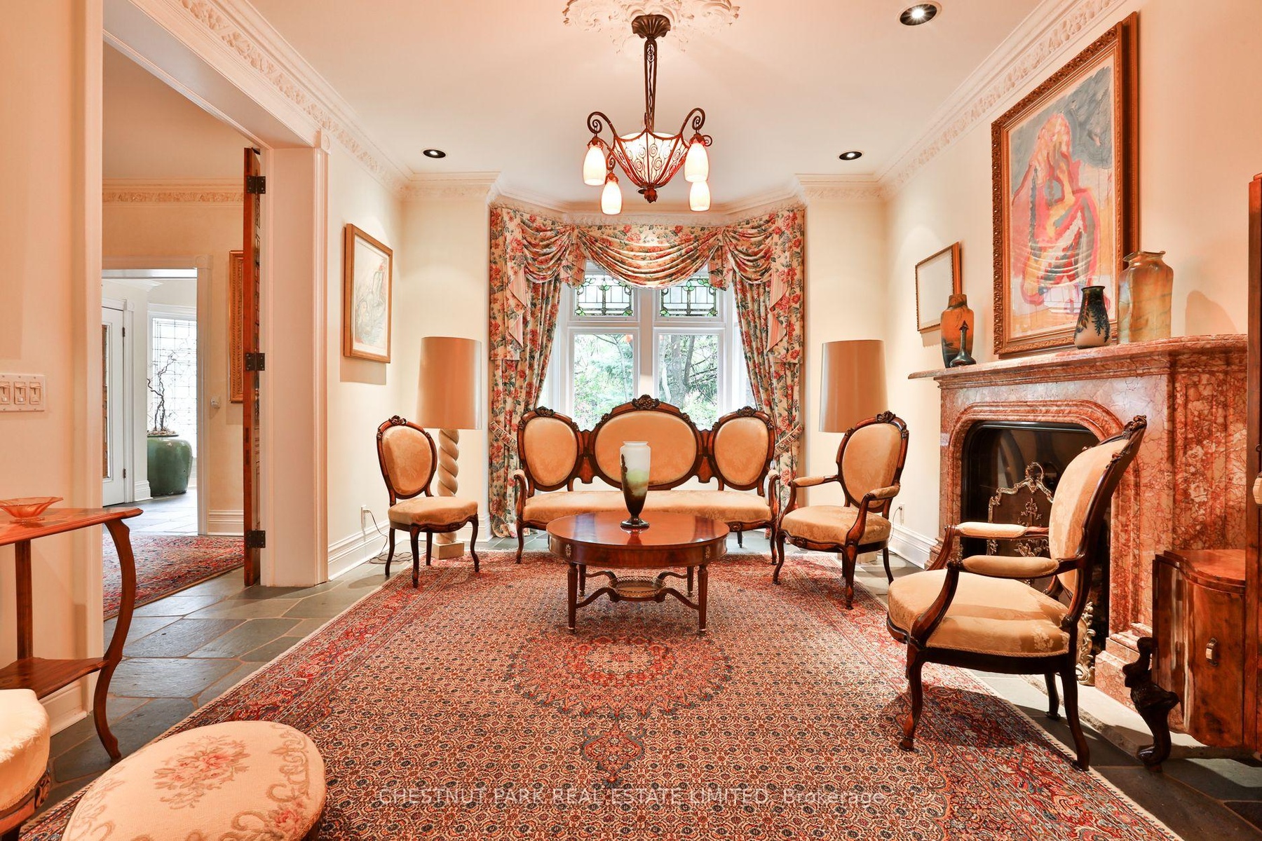 One of a kind old world European vibe. Over 7,000 square feet of incredible character filled space with 7 car gated parking. A unique blend of Ralph Lauren mixed with Aspen, Cabbagetown, Riverdale, the Annex and Rosedale. 4 gas fireplaces on main imported from Europe, 9 foot stained glass doors. Columns, pillars, high ceilings, 6 bedrooms, 6 bathrooms, an incredible chef's kitchen with aga stove and barbeque. Island warming ovens. Tranquil private ravine 245 ft in back with 2 tiered decks. Double car built-in garage.