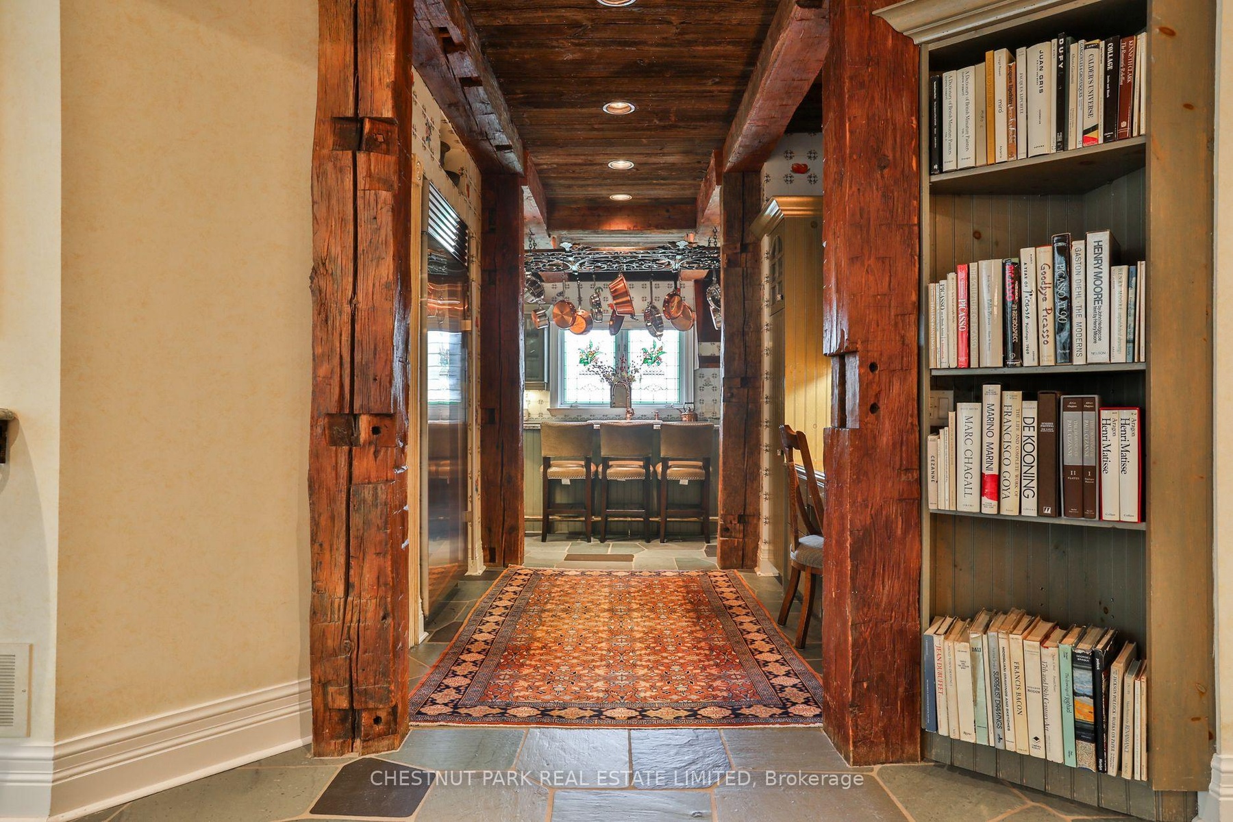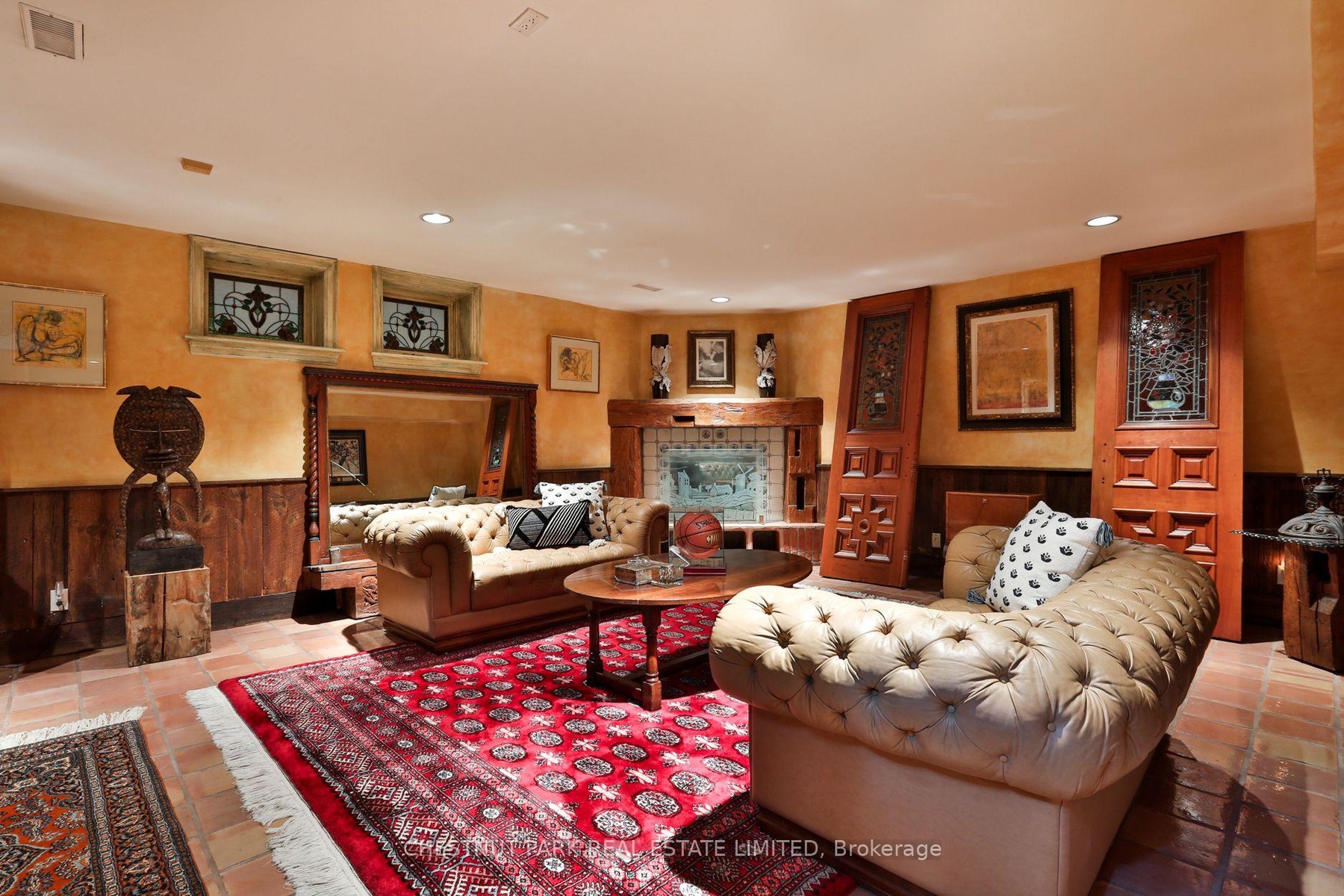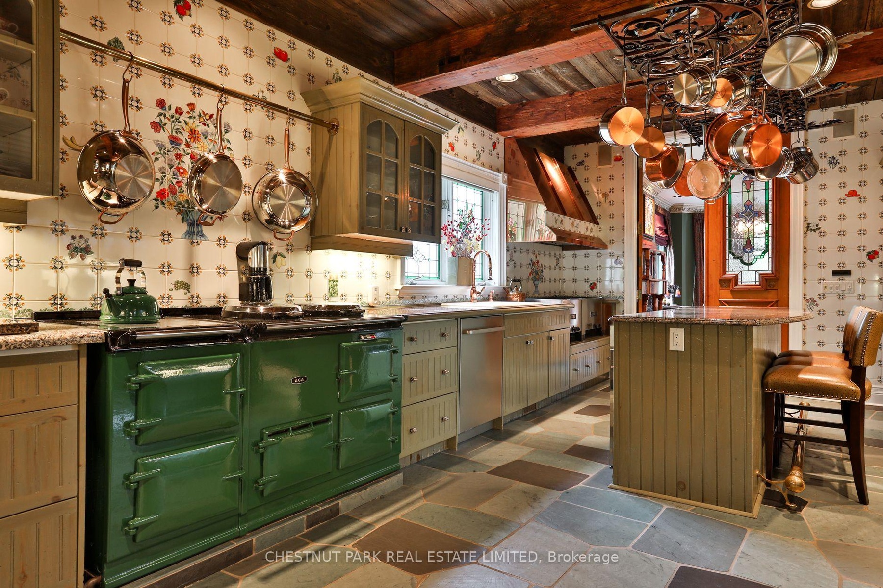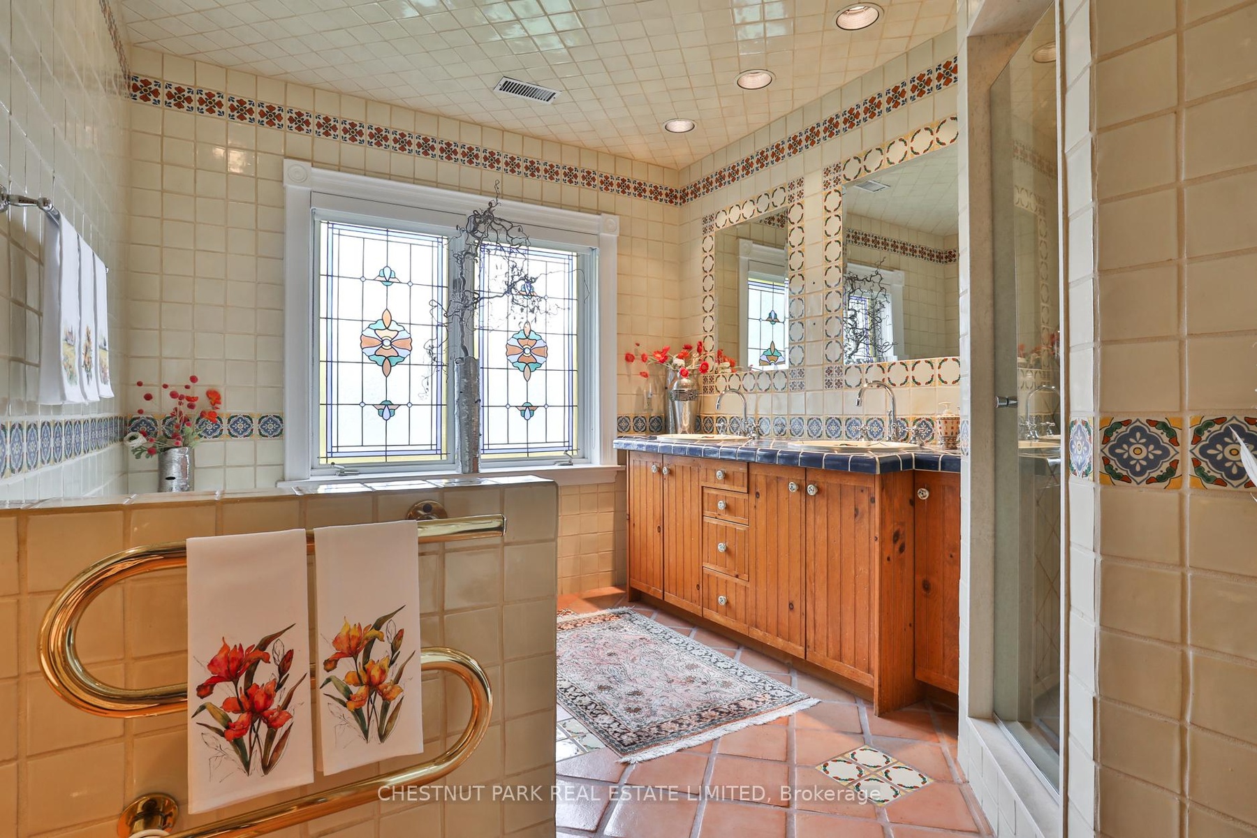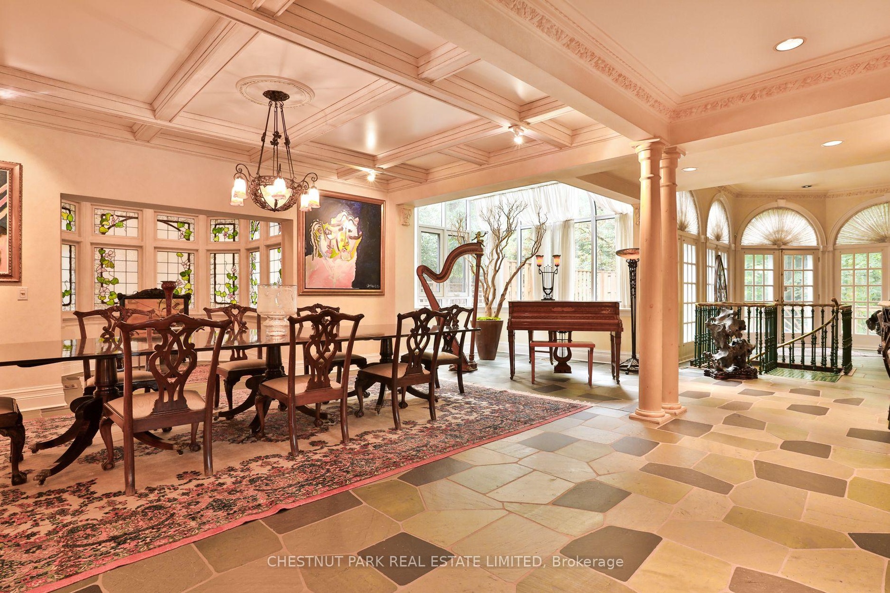 One of a kind old world European vibe. Over 7,000 square feet of incredible character filled space with 7 car gated parking. A unique blend of Ralph Lauren mixed with Aspen, Cabbagetown, Riverdale, the Annex and Rosedale. 4 gas fireplaces on main imported from Europe, 9 foot stained glass doors. Columns, pillars, high ceilings, 6 bedrooms, 6 bathrooms, an incredible chef's kitchen with aga stove and barbeque. Island warming ovens. Tranquil private ravine 245 ft in back with 2 tiered decks. Double car built-in garage.
