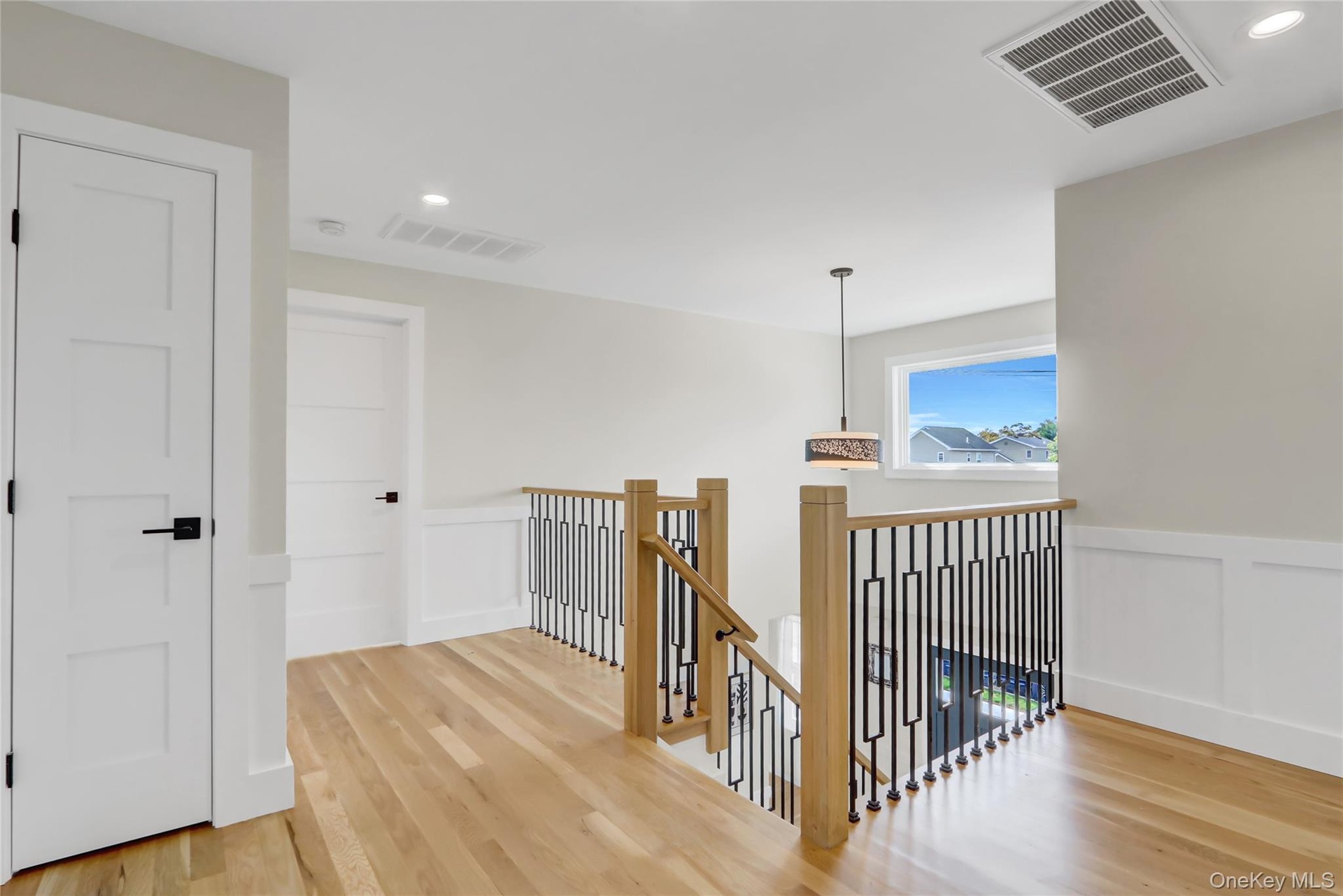 - Hallway featuring an upstairs landing, recessed lighting, a wainscoted wall, light wood finished floors, and a decorative wall