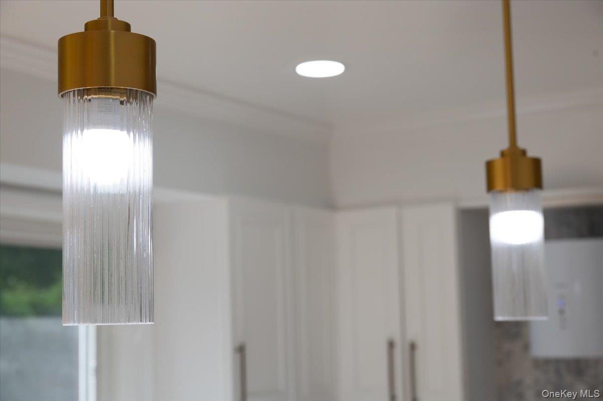 - Kitchen featuring stainless steel appliances, decorative light fixtures, white cabinets, light wood-style flooring, and backsplash