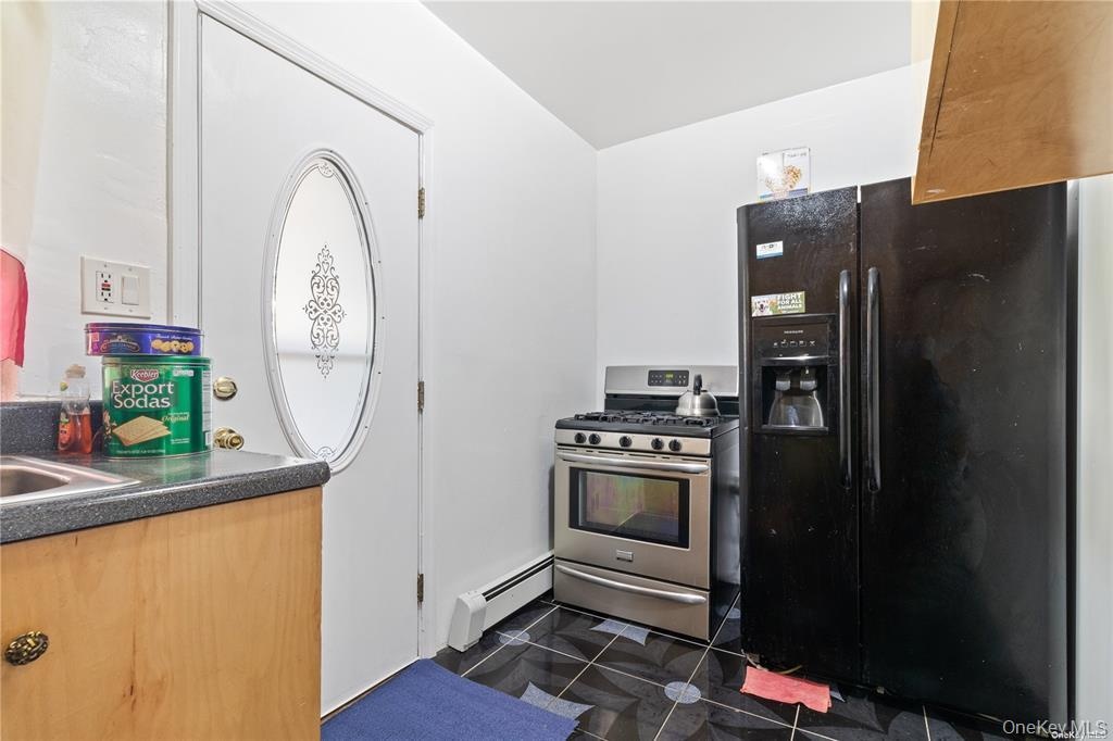 - Kitchen with black refrigerator with ice dispenser, gas range, a baseboard radiator, dark tile patterned flooring, and dark countertops