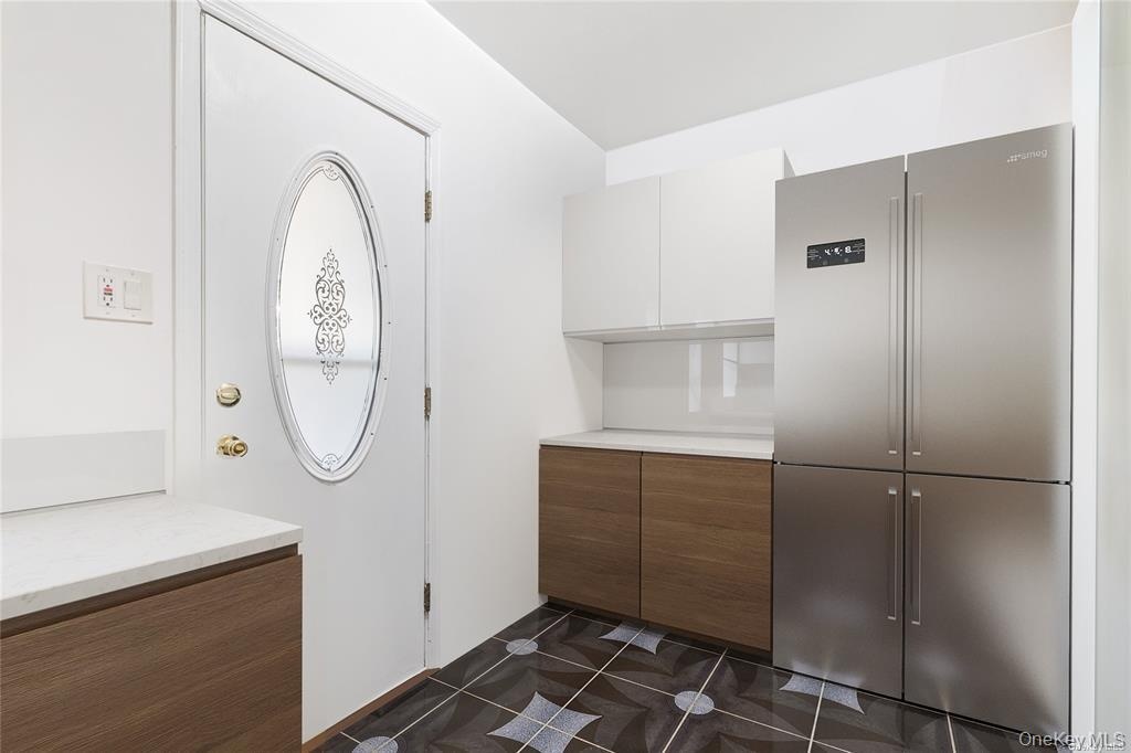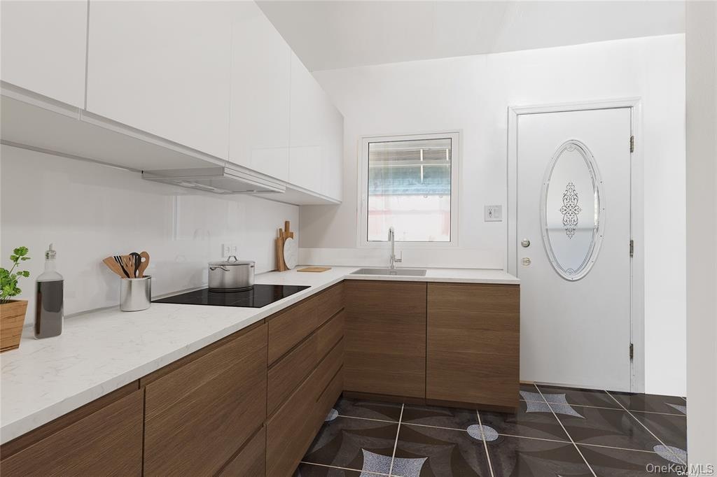 - Kitchen with brown cabinetry, white cabinets, modern cabinets, black electric cooktop, and dark tile patterned flooring
