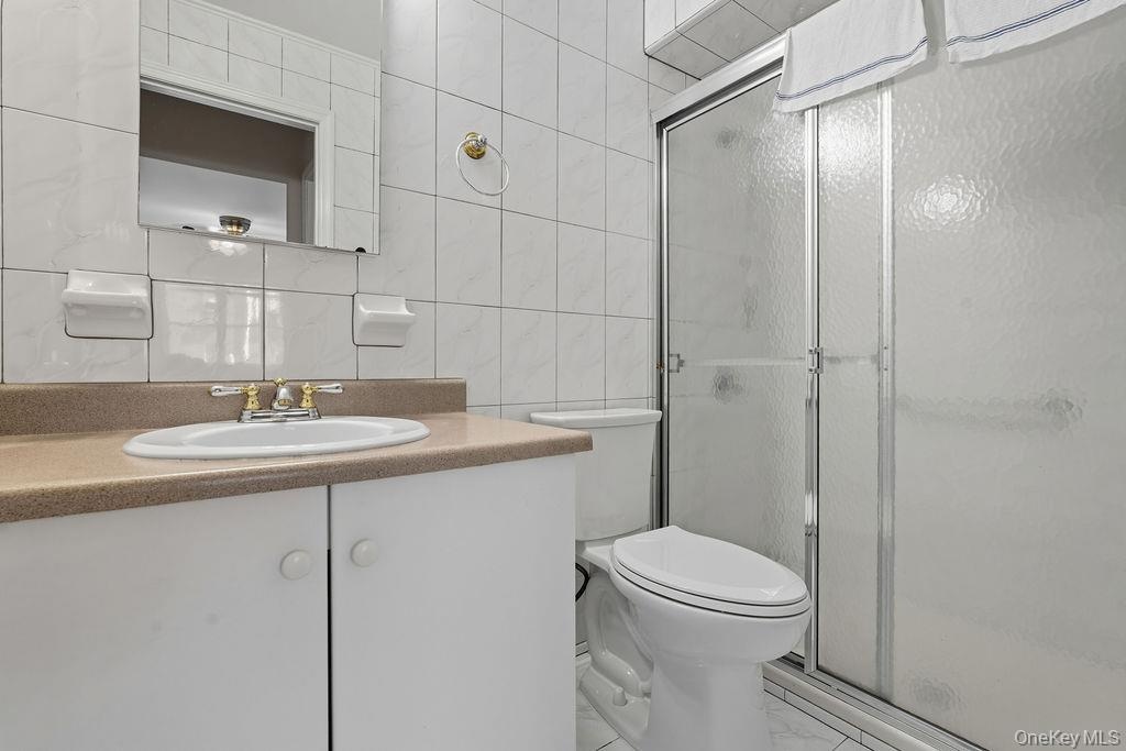 - Bathroom featuring tile walls, a stall shower, vanity, and tasteful backsplash