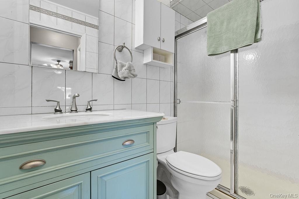 - Bathroom featuring tile walls, vanity, a shower stall, and tasteful backsplash