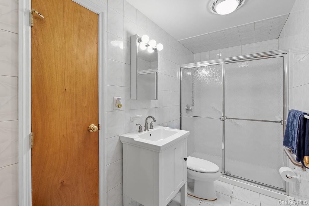 - Full bath featuring tile walls, a shower stall, vanity, and tile patterned floors