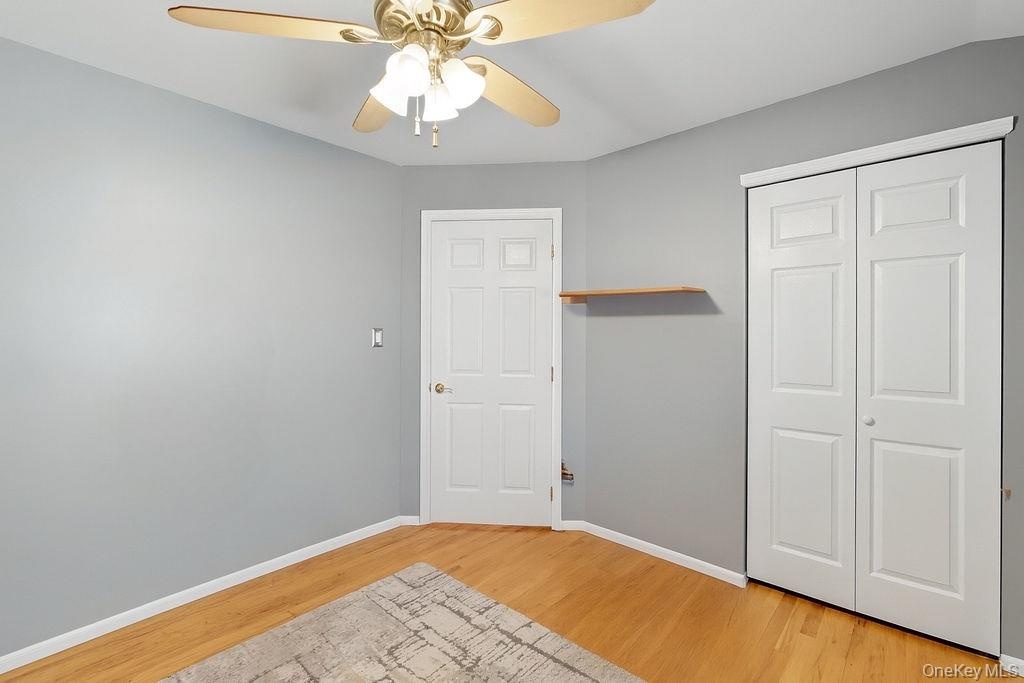 - Unfurnished bedroom with light wood finished floors, a closet, and ceiling fan