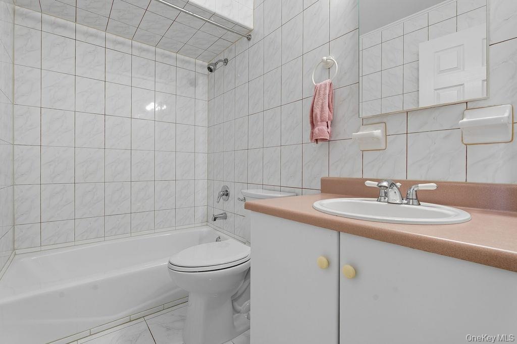 - Full bathroom featuring washtub / shower combination, vanity, tile walls, and backsplash