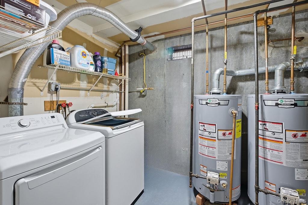 - Laundry room with water heater, concrete flooring, and separate washer and dryer
