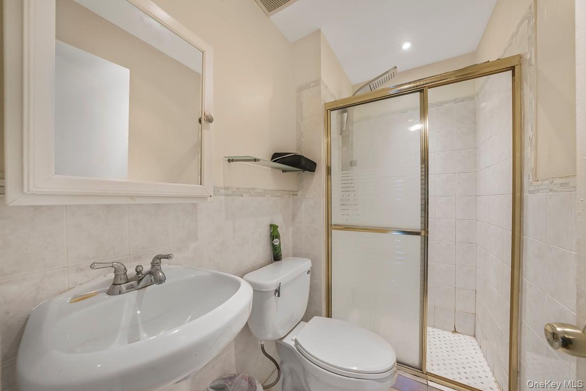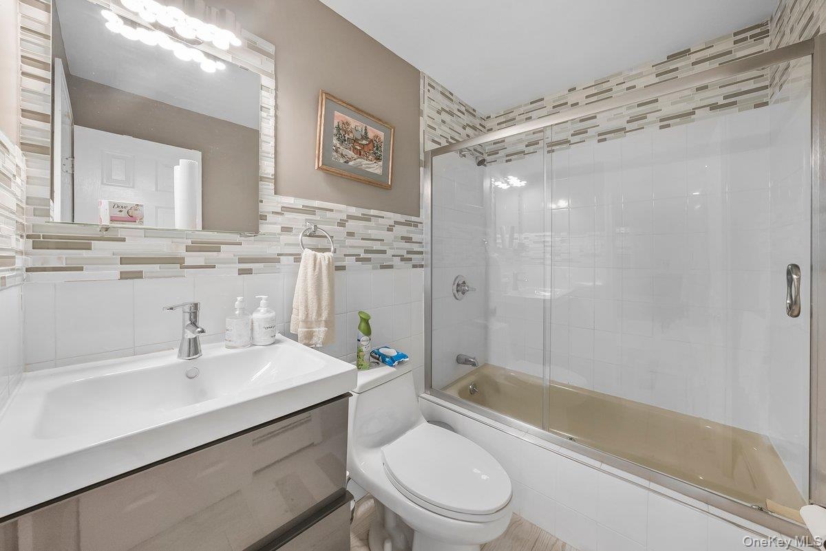 - Full bath with bath / shower combo with glass door, tile walls, and vanity