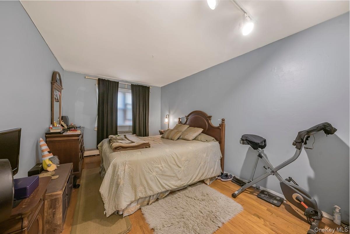 - Bedroom with wood finished floors, track lighting, and a baseboard heating unit