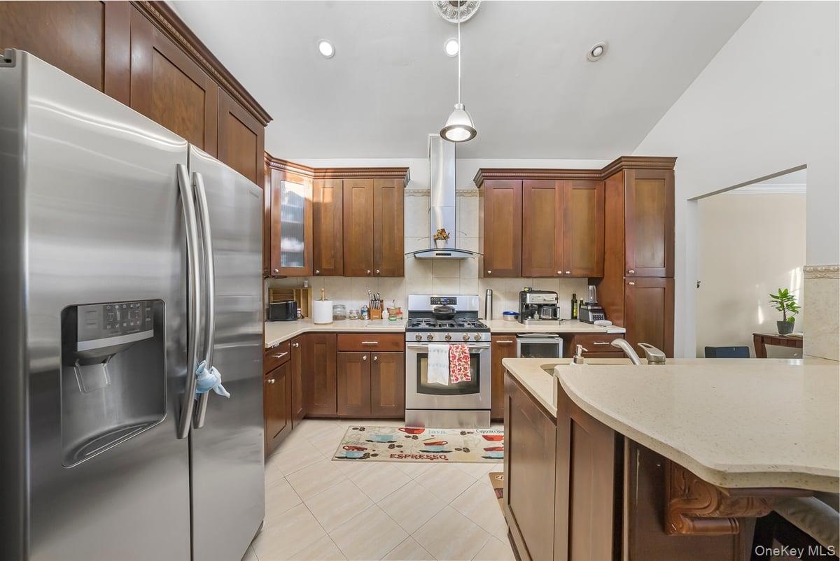 - Kitchen with appliances with stainless steel finishes, wall chimney range hood, tasteful backsplash, light tile patterned floors, and light stone coun