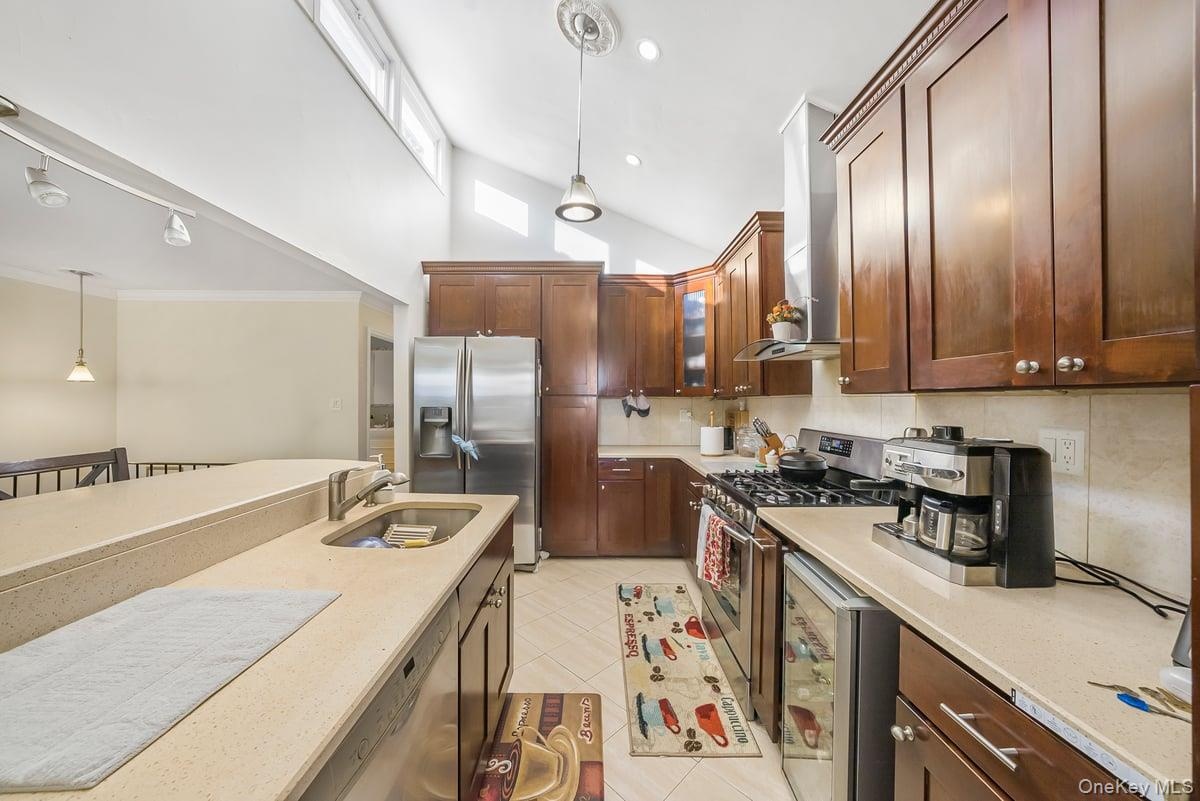 - Kitchen featuring pendant lighting, backsplash, appliances with stainless steel finishes, glass insert cabinets, and light stone counters
