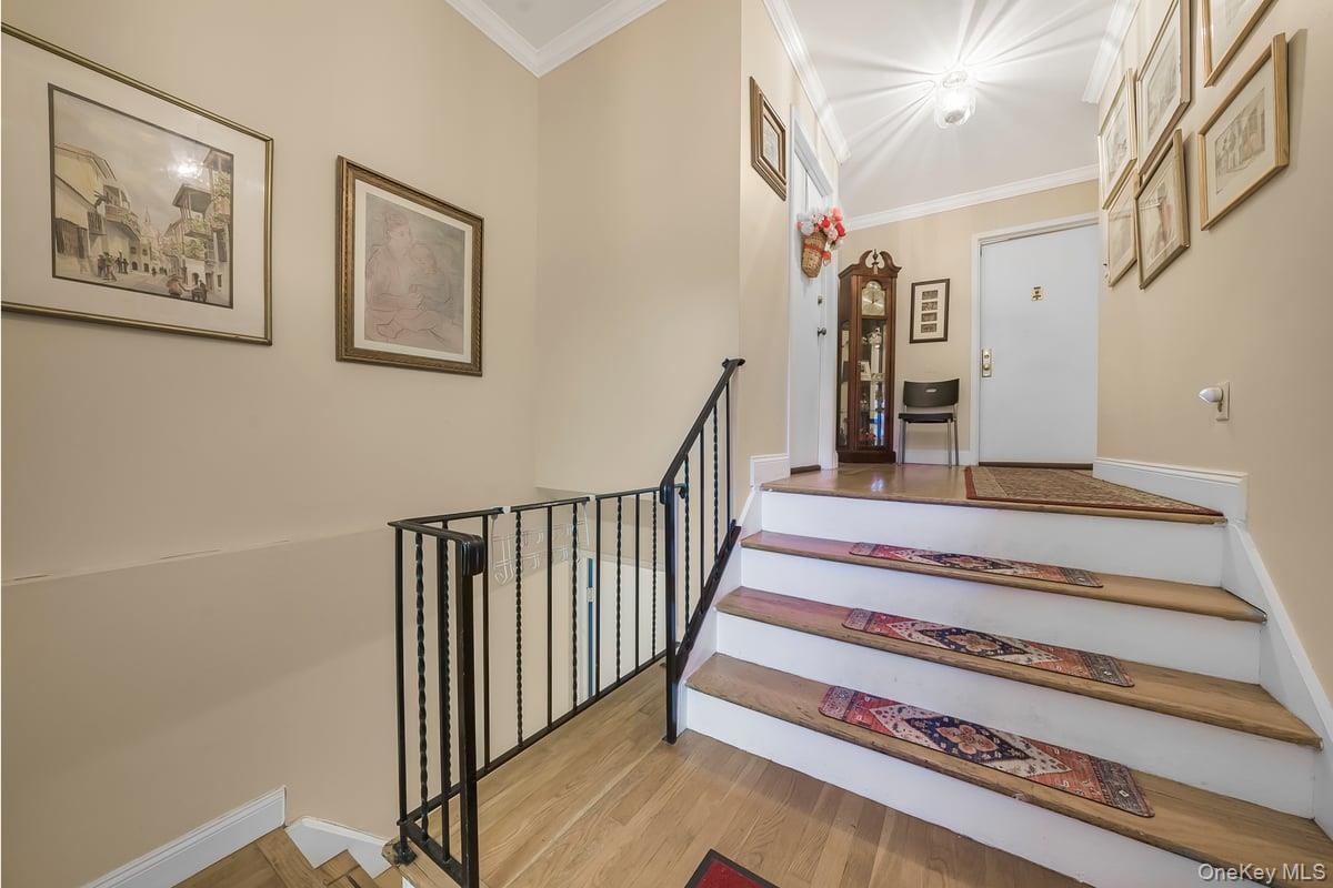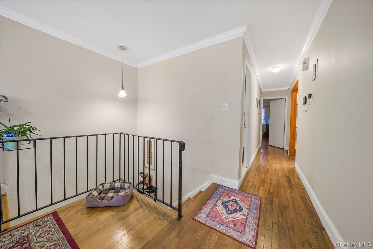 - Corridor with crown molding, hardwood / wood-style flooring, and an upstairs landing