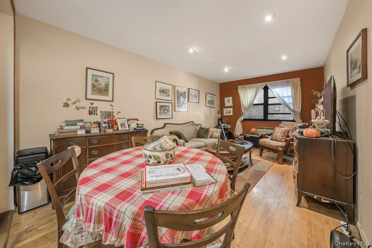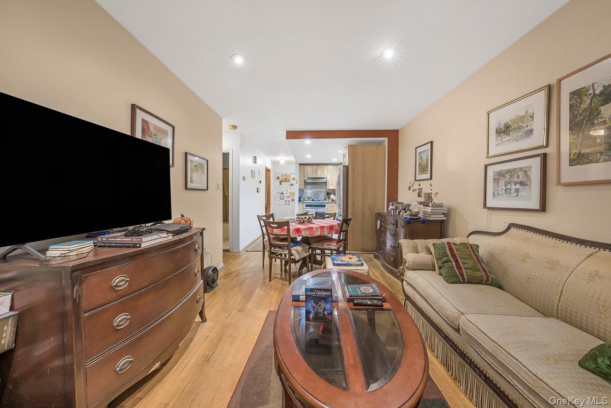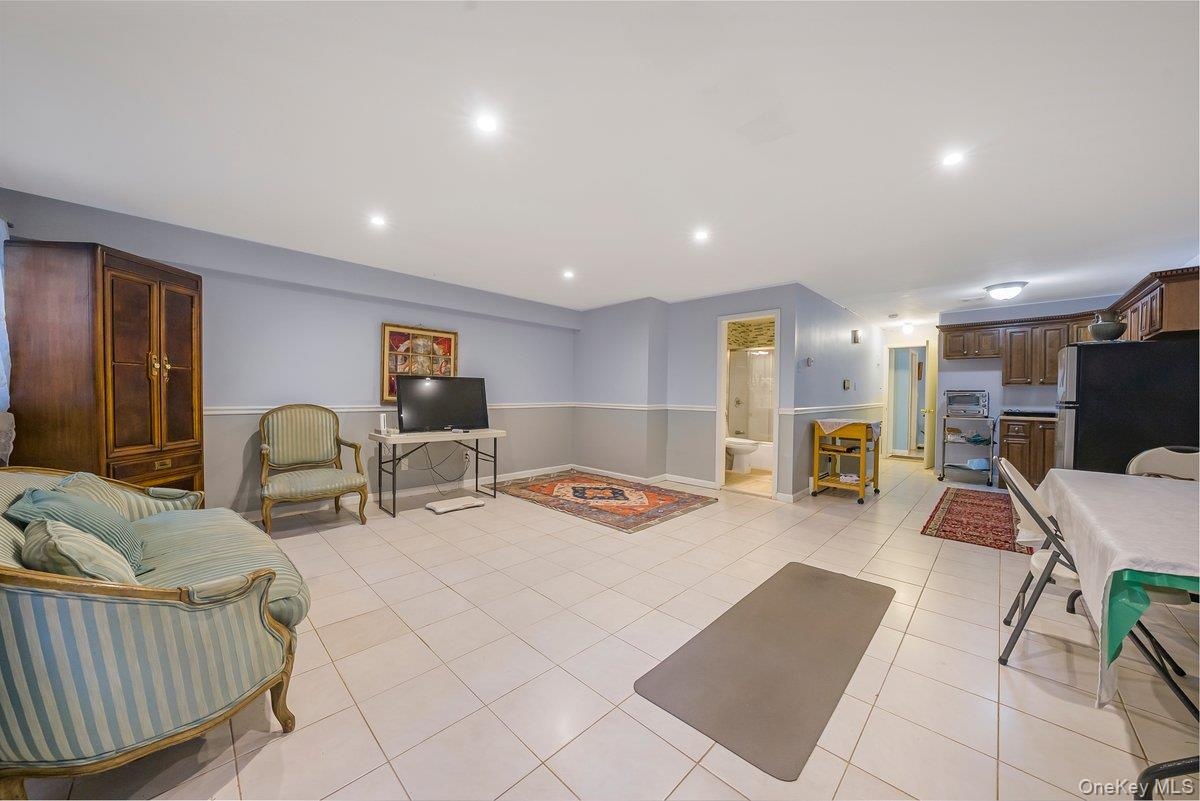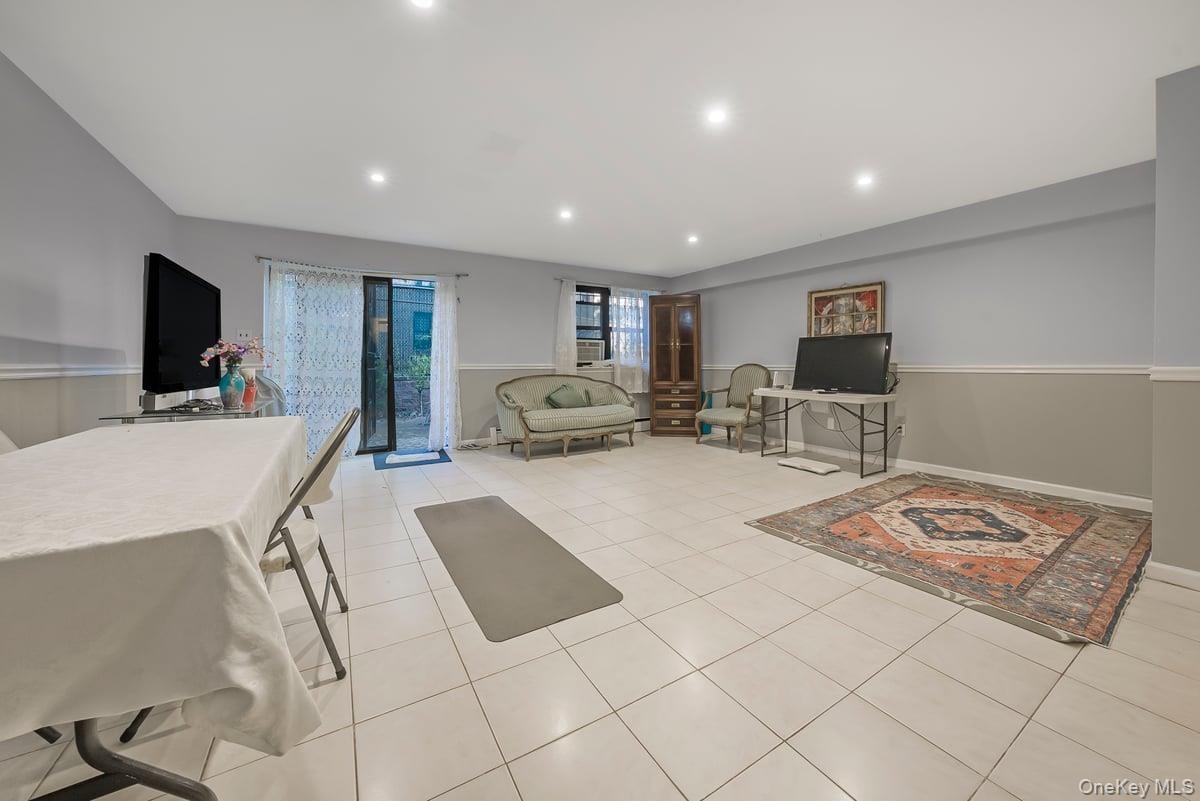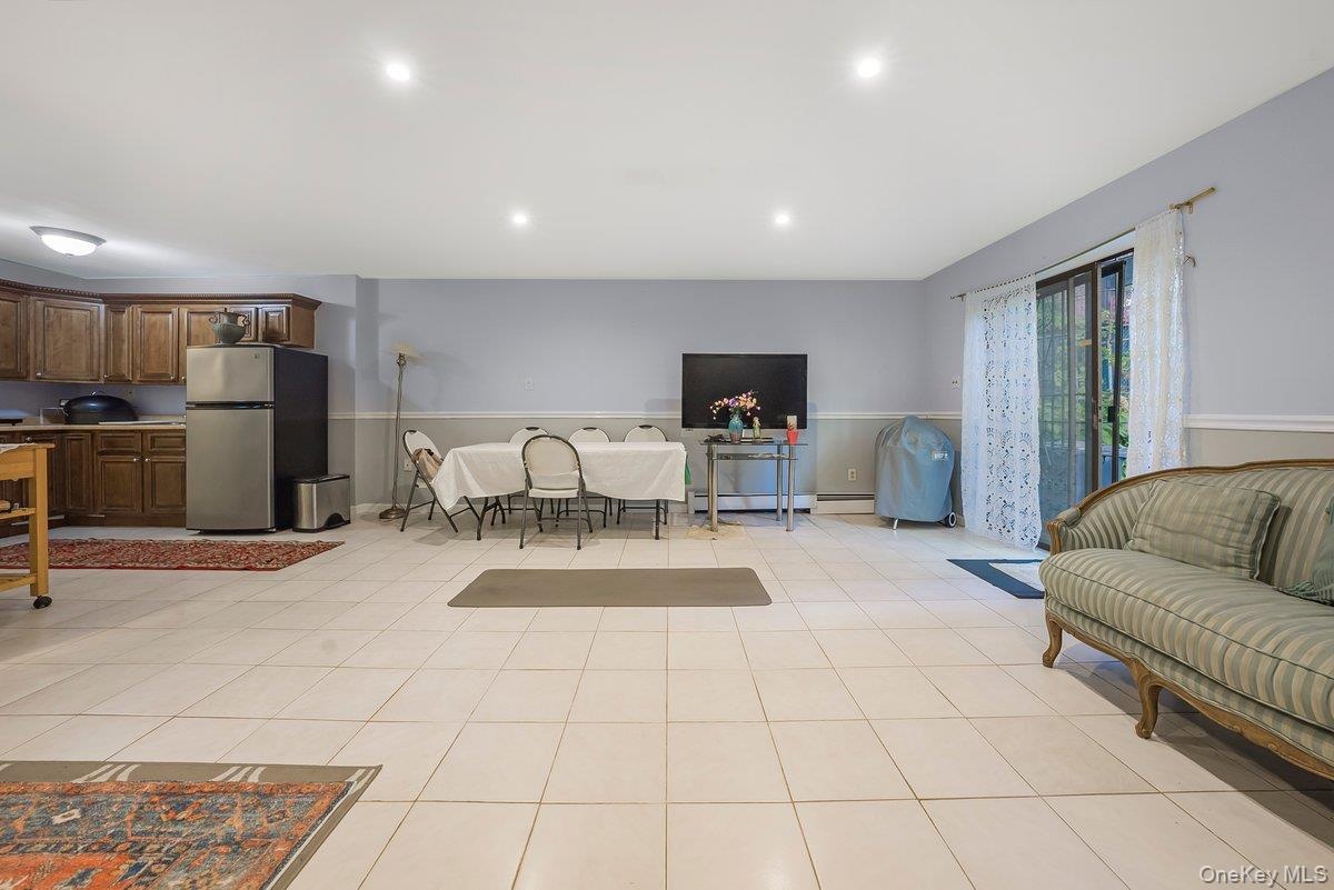 - Living room featuring light tile patterned floors, recessed lighting, and a baseboard radiator