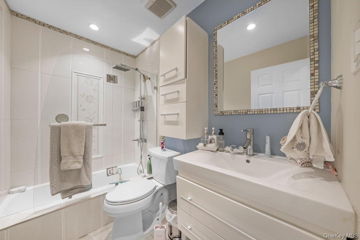 - Full bathroom featuring tiled shower / bath combo, vanity, and recessed lighting