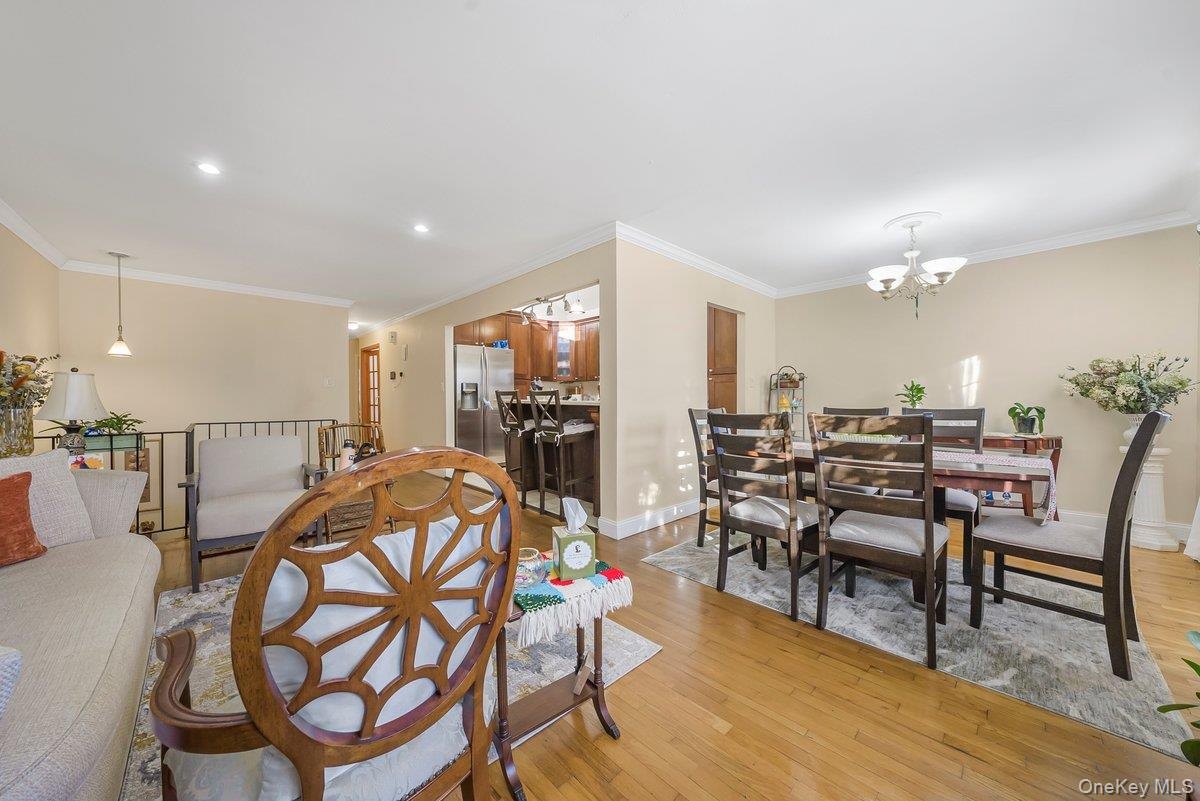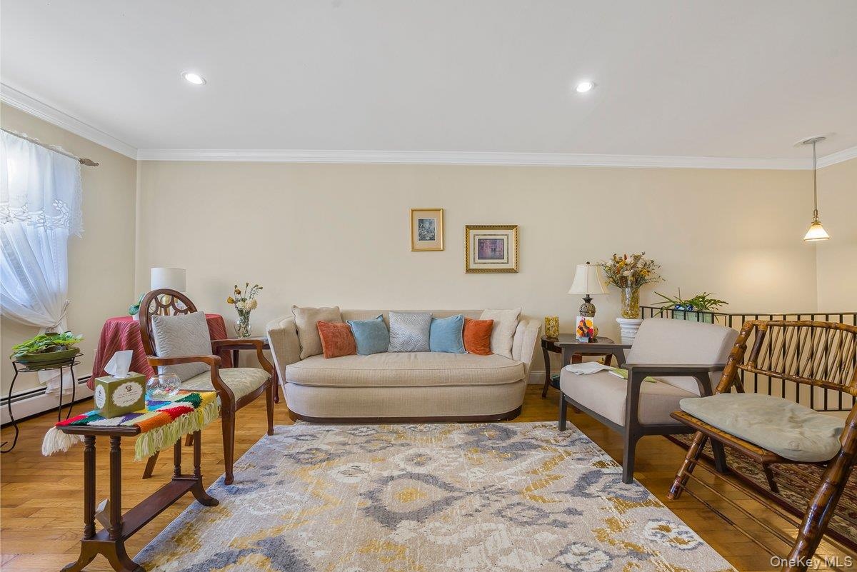 - Living area featuring ornamental molding, wood finished floors, and recessed lighting