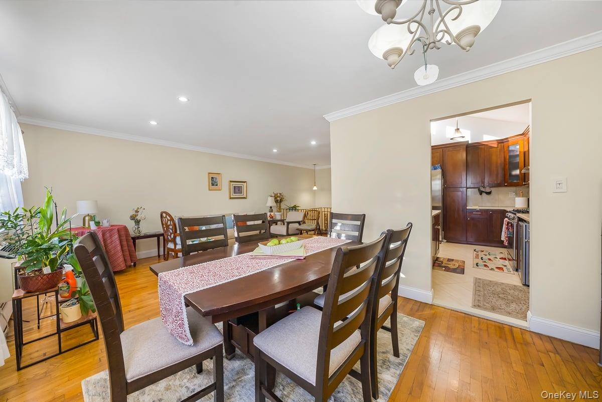 - Dining room with crown molding, a chandelier, light wood-style floors, and recessed lighting