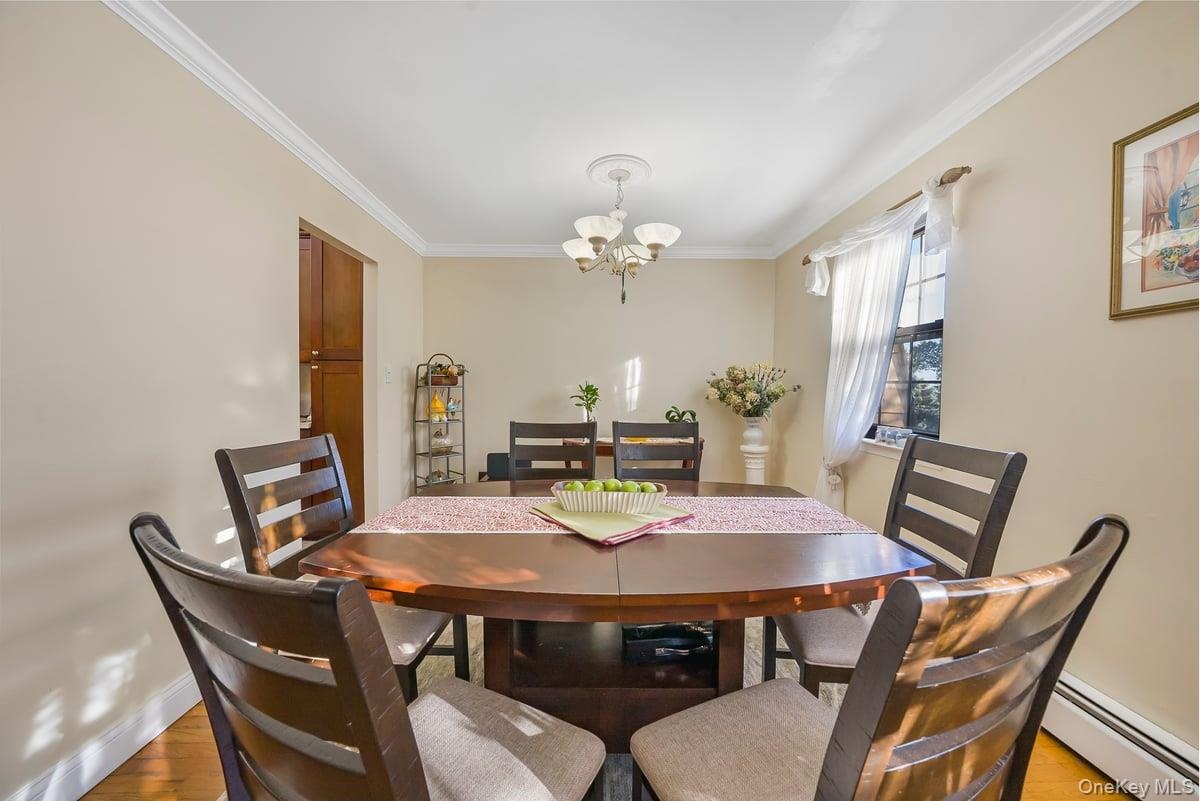 - Dining room with crown molding, a baseboard radiator, wood finished floors, and a chandelier